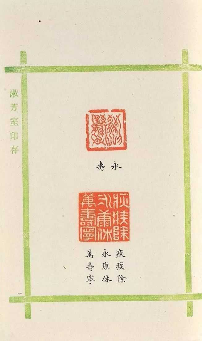 中国人都追求吉利,渴望祥和,会崇拜一些超自然力量,如信奉鬼神、瑞兽等,因而,早在商周时期,神兽纹样、吉祥图案、几何图形等已经出现,并应用于青铜器、陶器、古玺等。古人将这些元素融入日常物品或工艺品之中,除作装饰之用,大多具驱邪、招福等寓意。印谱族群中,文人墨客将龙纹、回纹、万字纹、卷草纹、富贵子、蝙蝠、祥云、暗八仙、双环纹等融入版框纹饰中去,由清中期迄民国,此等纹饰比比皆是。