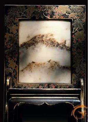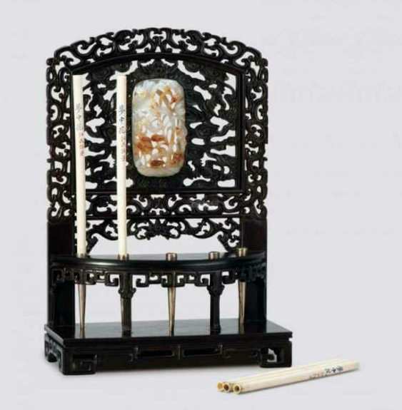 明代出现了笔插与袖珍小屏风合体的专用文房用具——“笔屏”。明人高濂《遵生八笺》“论文房器具”一节即有“笔屏”一条云:“宋人制有方玉、圆玉花板,内中做法,肖生山树禽鸟人物,种种精绝。此皆古人带板灯板,存无可用,以之镶屏插笔,觉甚相宜。大者长可四寸、高三寸。余斋一屏如之,制此似无弃物。有大理旧石,俨状山高月小者、东山月上者、万山春霭者,皆余目见,初非扭捏,俱方不盈尺,天生奇物,宝为此具,作毛中书屏翰,似亦得所。”由之可知,明代文人颇喜欢笔屏,主要目的仍是在于“插笔”。笔屏讲究的是用材珍稀,制作精美,除实用功能之外,作为陈设品的性质也很鲜明。