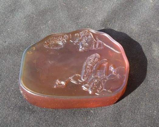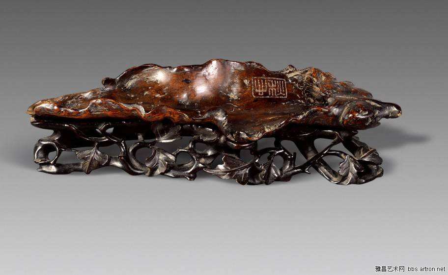 笔觇,俗称笔掭,是觇笔之器。古人运笔除了可在砚上掭笔外,更备有掭笔之物,谓之笔觇。有瓷制、玉制、琉璃制、水晶制等,这种笔觇近代已不常用,因此许多人对这一名词已觉生疏。旧时笔觇向以定窑或龙泉窑小浅碟式为最佳。为何有笔觇与笔掭两种名称呢?因为这是古代文人舐笔工具演变的过程而形成的。可以这么说,自从诞生了毛笔后,就出现了舐笔的需要,舐笔可在砚上,也可在纸绢上,作为一个单独的舐笔工具,且具有文玩含义的舐笔文具,大约在宋代,现存有南宋哥窑荷叶形笔觇。“笔觇”一词,最早出现于明代,明后期文房清玩的风气愈渐兴盛,其间文人竞相编书立作,论述文房器物,经典文著有《长物志》与《考盘余事》。笔觇到了清代,发生了材质与造型上的变化。材质由陶瓷、玉石类,改变成更具有应用功能的砚石,尤其追求石中名品,如端石中的鱼脑冻、蕉叶白、天青,歙石中的罗纹、眉子、金星等。所以它们的观赏性和收藏价值常常要胜过实用价值。笔觇的造型也发生了变化,由原先的花色浅碟状,演变成不事雕琢,打磨细腻的砚式素面状。它又可分为两大类,其一为做工厚重、古朴的几何形状,以长方形居多,亦有花状与祥云形等,均为光滑素面,最多在石边略加边款刻字,故又有“砚砖”之名。其二,取天然仔料磨平而为之,留有天然的皮色,纯朴而古雅,又可称“仔砚”。至此,笔觇名称也变成“笔掭”了。