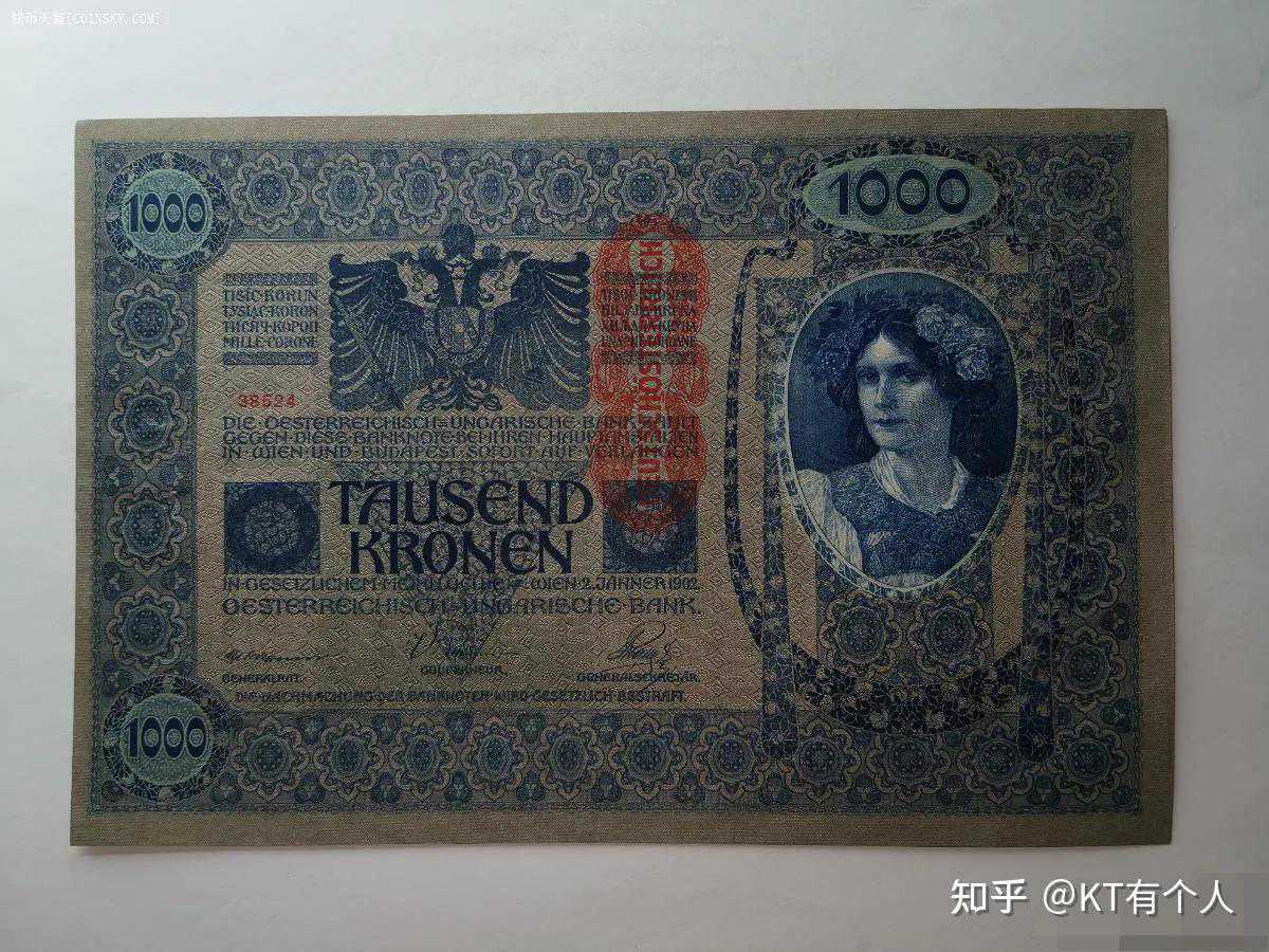 奥匈帝国统治下的奥地利于1902年发行了1000克朗纸币,它是手工雕刻制版并印刷的,票幅直接达到192mmx128mm