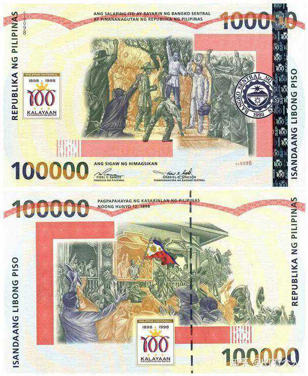 接下来说的这张纸币就是大神级别的了,它就是1998年菲律宾发行的面值为10万比索的独立一百周年纪念钞。