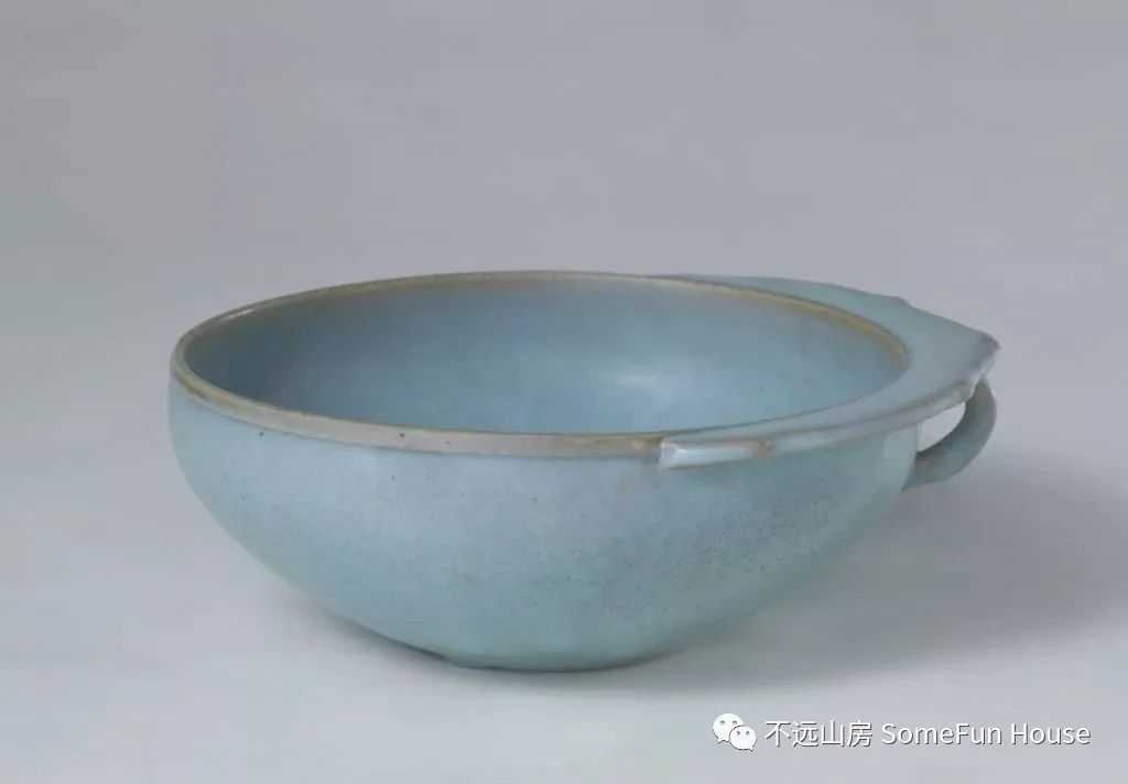河南博物院藏金代钧窑月白釉单柄杯,金代,高7厘米,口径17厘米,1966年从开封市文物商店购买。尖唇,口微敛,浅弧腹,圜底,底部微凹。口沿一侧出菱式折沿,沿下有一环形耳与腹部相连。通体施月白釉,满釉支烧,外底有三个支烧痕。