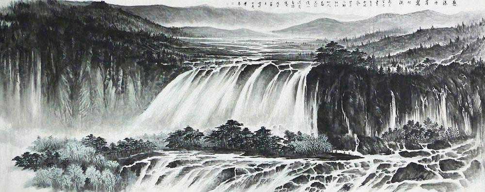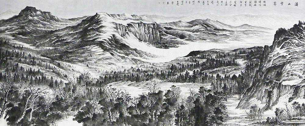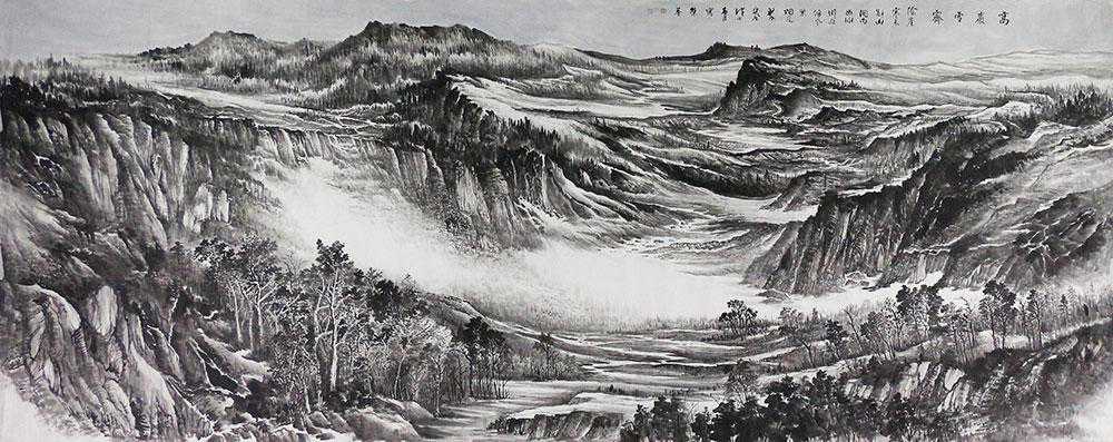 “雪”在我国传统思想中,象征着仁爱精神和高沽品质,是人们竞相歌颂和赞美的对象,也是绘画作品的主题,雪景山水画作为中国山水画中的一个生态体,其历史源远流长,并随着历史的发展不断地演进,从萌芽的晋代发展到当代,每个时期都是在继承中有所创造,而具有其独特的艺术生命力。这幅付荣基老师的丈二山水作品《西山雪霁》,俯瞰角度取景,颇为大气,线条运用生动细腻,一场大雪后,溪山被白雪覆盖着,山间杂木呈现万千姿态,虽是冬季,给人的感觉却是生机依然,局部浓墨晕染,更烘托出浓浓雪意,品赏中似有清冽之气扑面而来,富有艺术感染力。