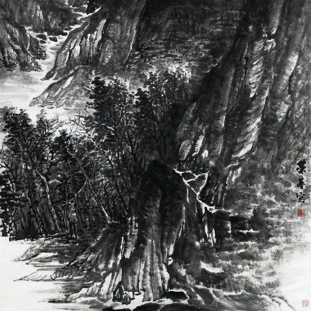 一雪一景、一山一水,经过艺术的加工都变成了诗人画家内心情感的真实写照,同时雪景山水画也具有极高的艺术价值。这幅付荣基老师的作品,与上两幅相比,墨色稍显深沉,局部特写出山峰,更显质感,树木也是浓墨为主,构图繁密,山中点点白雪点缀,相映相宜,蜿蜒的溪流从远方流过来,令整个画面顿时鲜活起来,似有欢快的泉声传入耳帘,踱步白雪覆盖的小径上,寻觅安放心灵的静谧之地。老师的国画作品地貌特征鲜明而真切,看似平淡,却有特色,极富笔墨趣味。