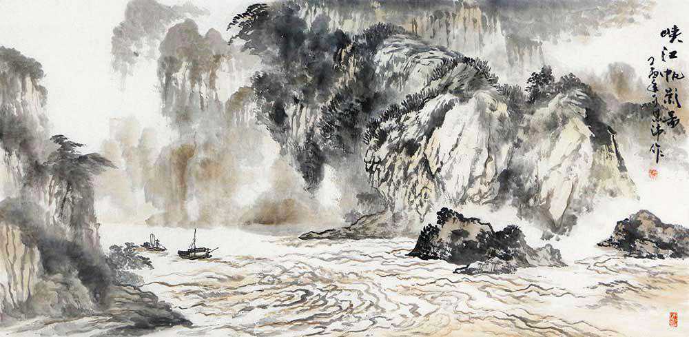源远流长的国画山水画是中国山水画众多的作品中的一类,很多都有着美好的风水寓意,是中国传统艺术的重要体现,也是中式装饰中不可或缺的古典元素,备受人们的喜爱。这幅于恩沛老师的国画山水《峡江帆影图》,构图新颖,工写俱佳,画面中绘轻烟淡峦,山势险峻,一条溪水从山峡间潺潺流过,两岸芳草润泽,行驶的船帆映入眼帘,天人合一的意境,令人感受到世外桃源般的宁静祥和。整幅作品意境清幽,颜色典雅、悦目怡心,画风独具一格,给人以高雅的艺术享受。