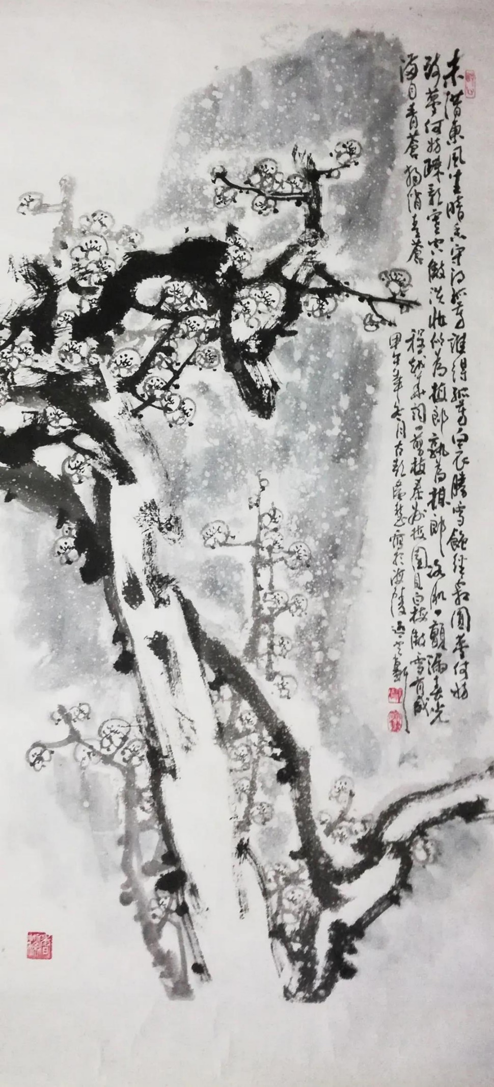 关于广慧的梅花,我是比较推崇的,“傲骨梅无仰面花”,广慧画梅充斥一种豪迈之情,人与梅花融为一体,迎风傲雪,多铁骨铮铮之姿,疏放冷艳之中,有一种寂寞中的自足,玉蕊生香不染尘,远非俗家迎春手笔可比拟。这类佳作沙黑曾撰《梅花人间情》以力荐,文图互印相得益彰,眼前有景道不得,我也只能自叹笔拙,谈画止于斯了。