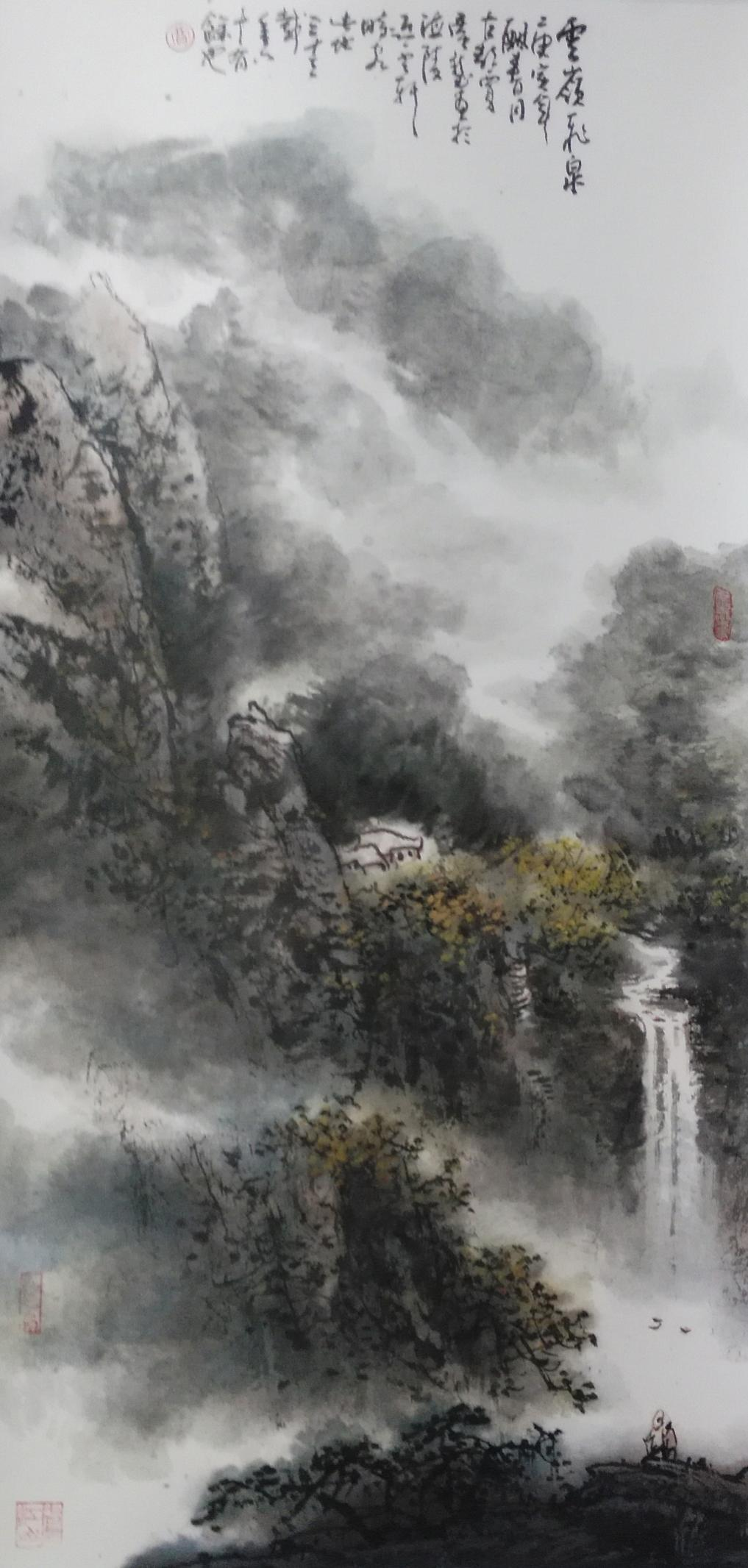曾在近云轩里亲眼看过几次广慧铺染山水,直叹挥斥之感淋漓尽致。迥于传统技法之由淡到浓层层递加,见他作画,每每临案静心屏气,砚中反复蘸墨润笔,一夕落纸笔健势涌,一笔紧连一笔,兼浓有淡,繁简相济,顾盼生姿,因势利导间变化迭出,须臾片刻之间,纸上山脉已由一角延至全幅,气势顿生这也是石涛“一画之法”的一种诠释吧。繁中见逸,悠然而成,在以重墨勾勒出山的轮廓后,广慧复于崇山峻岭之间,以简约的笔线粗写树木、屋含,随即便是随意自如的勾皴擦点与烘染泼积,娴熟老道的绘画语言驾轻就熟,笔随形运、墨从笔变,精致而丰富得连缀成气脉通畅的整体意象。或因近云轩,广慧画云极具特色,大笔蘸淡墨行运侧锋,云生其下如瀑布一般富有流动感,虚实相生中幻起有形,云之柔衬山之刚,即于计白当黑处亦成妙境。收尾以点苔,如为美人簪花,明显稠密之处以苔散之,过于疏朗之地以苔合之,有种天然妆就之感,点点顿挫亦如音符一般,凸显了画面的韵律感,山水相宜海潮音,属于高人手笔。