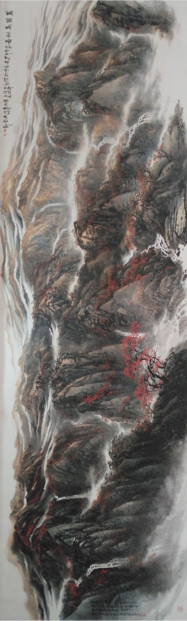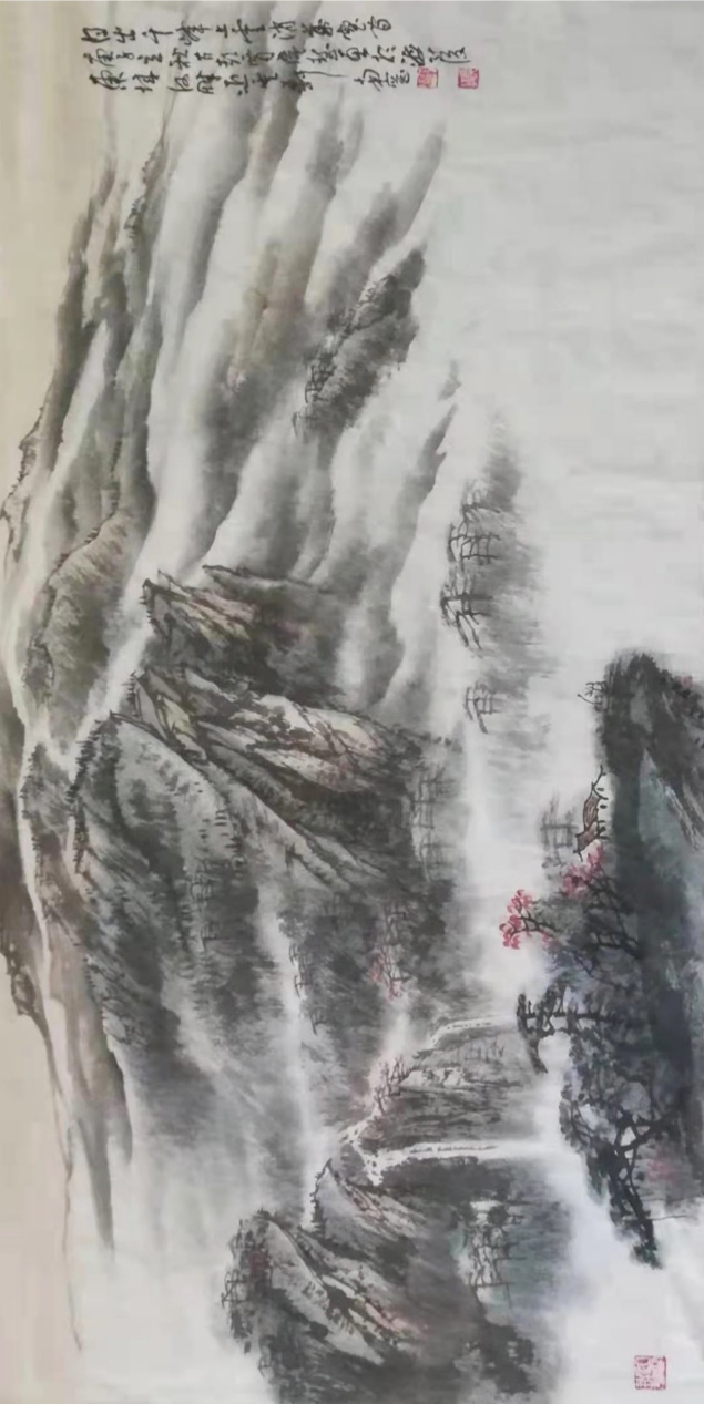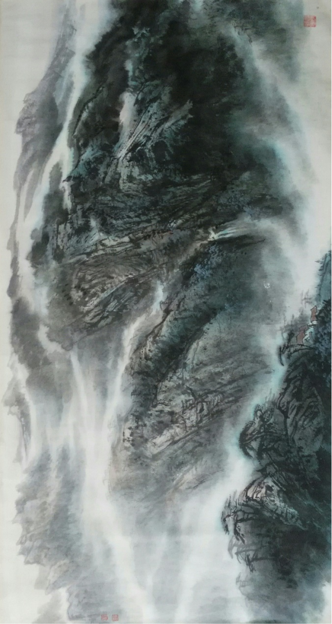 广慧的山水多为大幅,他应泰州净因寺请为之客堂所作山水堪称巨幅,宽竖六尺余,长足两丈四,逶迤群山,峰巅连绵,自然山水与宇宙天地融为一体,笔力找鼎,气势撼人,台湾了中法师看了亦叹为观止,直赞佳构天成,有磅薄大气存焉。记得画初成时,广慧约我近云轩看稿,画室很小,这边打开那边收起,山水叠折中,无限风光尽被占,瞬间的震撼感让我记忆犹新。