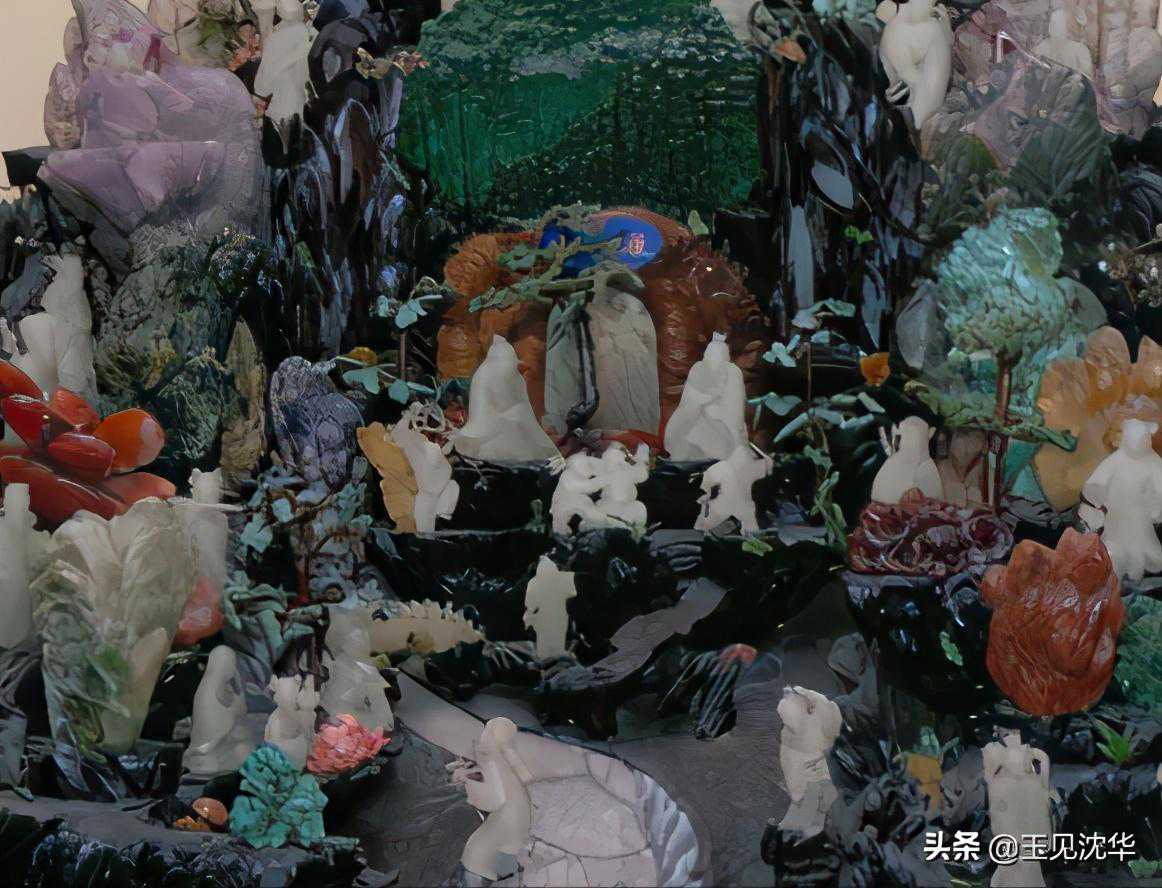 西王母、寿星、白猿、八仙是用玉雕成,其他的景石山树均用金星玻璃、松石、玛瑙,各色氟石雕做,用多种贵重材料,表现了庞大而热烈的场面,构成-座大型白玉彩石景观,看起来是五颜色六色、大饱眼福,可是细细观察,不难发现,玉石雕刻还是比较粗糙,不够精致。
