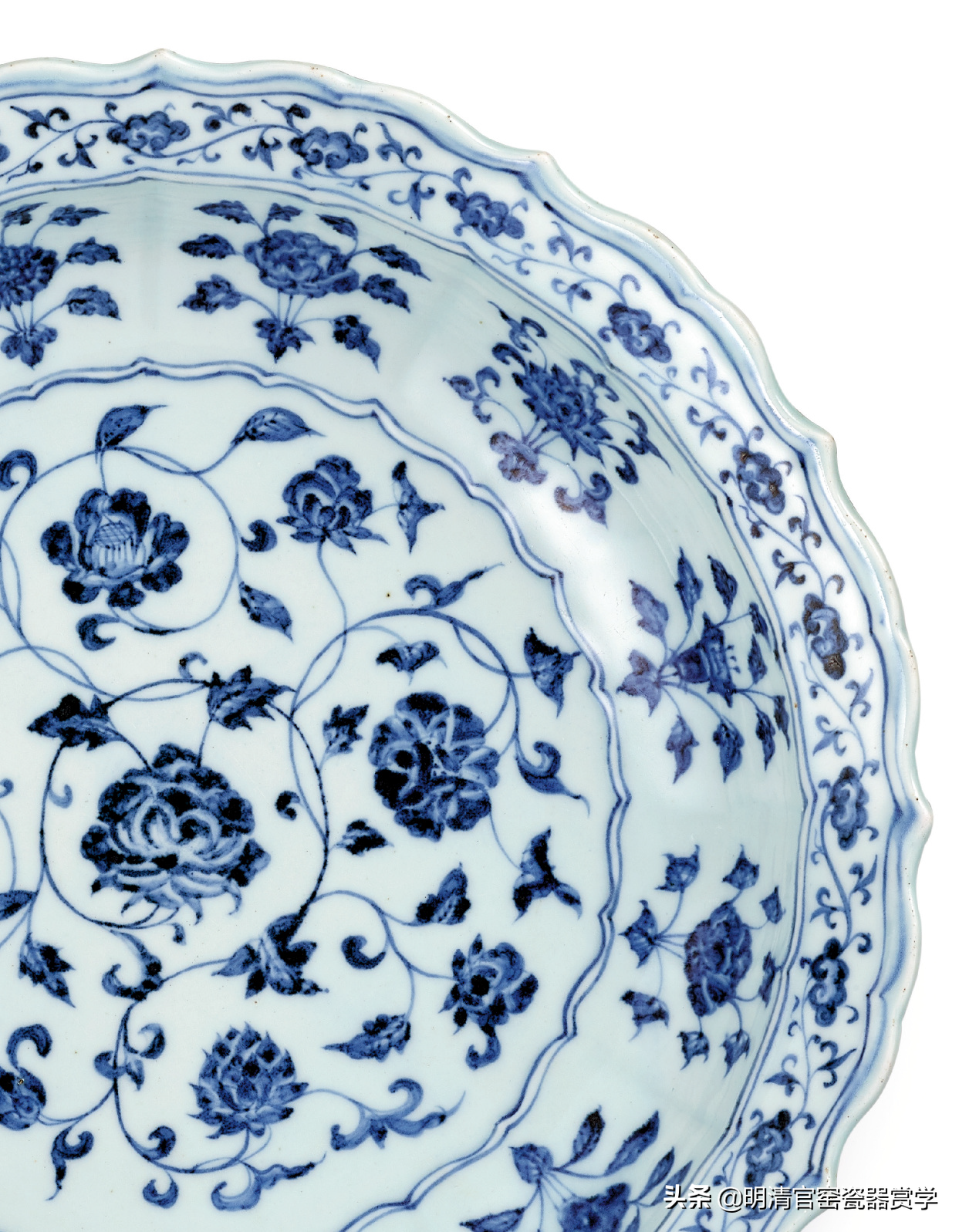 十四世纪,花繁枝盛之牡丹或莲纹甚风行,但至十五世纪初,较细致且富变化的折枝花卉代替缠枝花卉作为内壁图案,化繁为简,乃瓷艺纹饰发展史上的一大创新。盘内壁纹饰,一般以六折枝花卉为一组,重复一回共绘两组,是以相同的花卉一般落在对角两端。