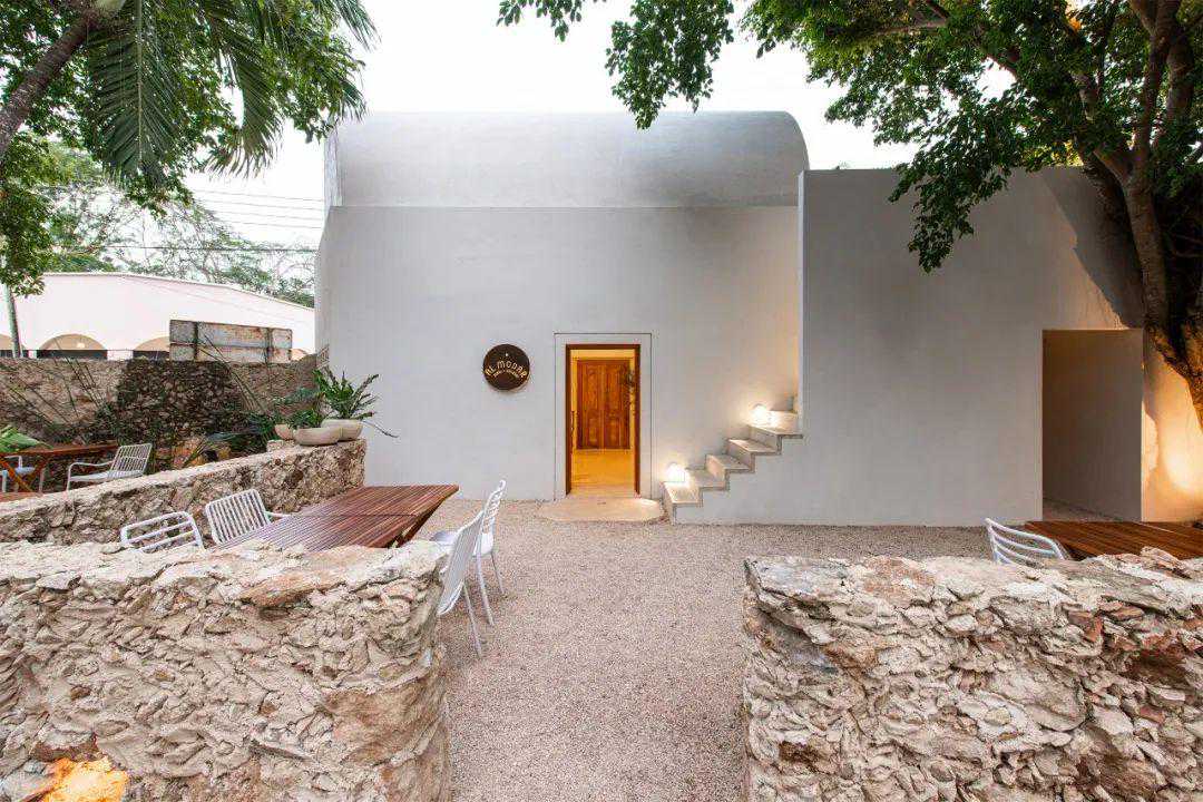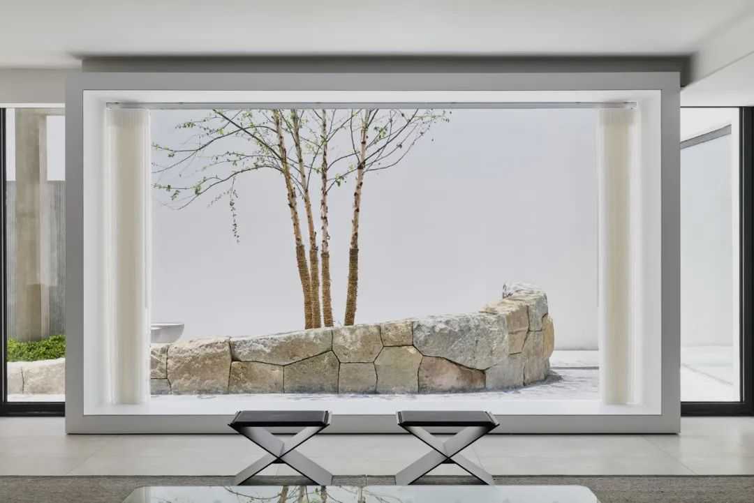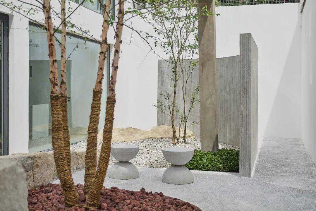 在宅隙的围合空间内,整体场地呈现几何形切割,地面的乱拼黄锈石做自然面及光面处理,由墙体嵌入拉开弧线。设计师顺应场地的结构形式,将已有的灰墙和混凝土框架作为框景和观看背景。