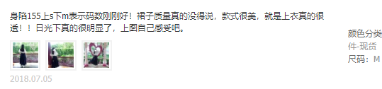 它家裙围有些小,不知道该买什么码数的妹子,可以参考上s下m来买套装噢。而且面料超透气,夏天穿也不会热~