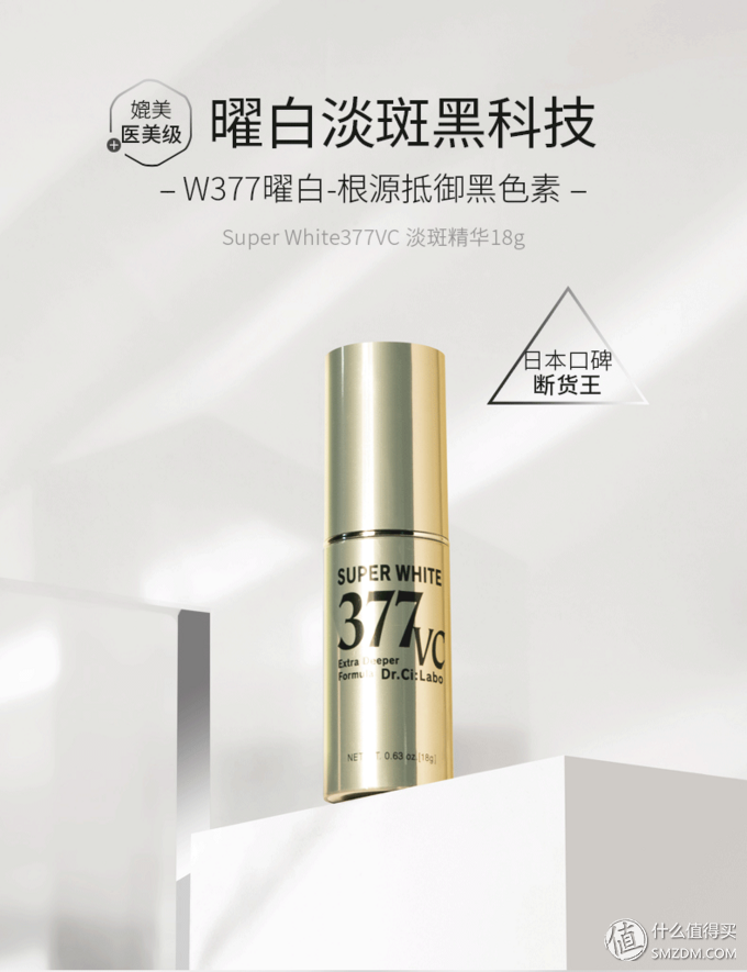 提起377,那就不能不提城野医生这款精华。从去年开始,在各大美妆平台上,可以说做到了谁人不知谁人不晓。号称为平价版小灯泡,它最主要功效就是阻黑净斑,还有预防斑的形成。这款精华相对比较温和,美白效果也要更好,既美白又抗氧化,好推开,不留泥。但是18g的量搭配420的售价,着实也不算平价了。但是它是日本护肤界首创使用抗酸化美白活性成分White377的产品,无化学合成剂添加,能修复暗斑,提亮肤色,美白净化效果极佳!是曲酸的10倍+,苯二酚的2100倍,熊果素的7000倍!配合美白的成分还有四己基癸醇抗坏血酸酯,属于维C的一种衍生物,有维C美白祛斑的效果,但是更加温和、稳定,不易分解。另外产品中还含有维A衍生物,以及一些活性成分,具有抗氧化作用,对抗衰老也有一定的作用,是一款不错的产品。这种数据,让我们不由自主的就剁了好几只手。喏,手,拿去!