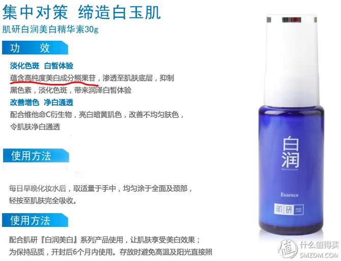 去购买曼秀雷敦的肌研系列,也算一个平价产品中的著名品牌了。有多少小仙女都是学生时代,从这个牌子开始进入护肤领域的。虽然长大以后才发现,他家的东西真的是很鸡肋,但是架不住价格诱人。而且现在曼秀雷敦家的产品线多的咬人,总有一款可以触动你的需求。比如这瓶精华,里面加了熊果苷,如果作为夜间美白补充的话,这个价格,完全可以放开手脚的往脸上招呼,而毫不心痛了!