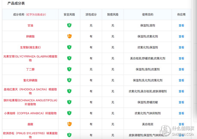 ▲可以看到主要成分。红色的为功效成分,包括安全风险、致癌风险、使用目的等都可以看得到。里面就可以看到有光果甘草提取物的内容,还有曲酸。可见黛珂还是挺货真价实。但是悄声嘀咕一句,如果光果甘草真的比曲酸值钱,为什么黛珂只宣传自己添加曲酸,而不宣传自己居然添加了这么黄金的光甘草定呢?而且搜遍全网都是力推一个什么雨的产品,说是添加了光甘草定,呵呵,大家自己想想吧。