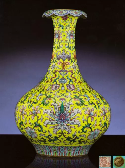 此件浅黄地长颈葫芦瓶之形制与纹饰皆为乾隆时期景德镇御作经典样式,图案设计雅致尊贵,装饰极富奢华品味,为此类工艺品中最具格调之御瓷佳作。