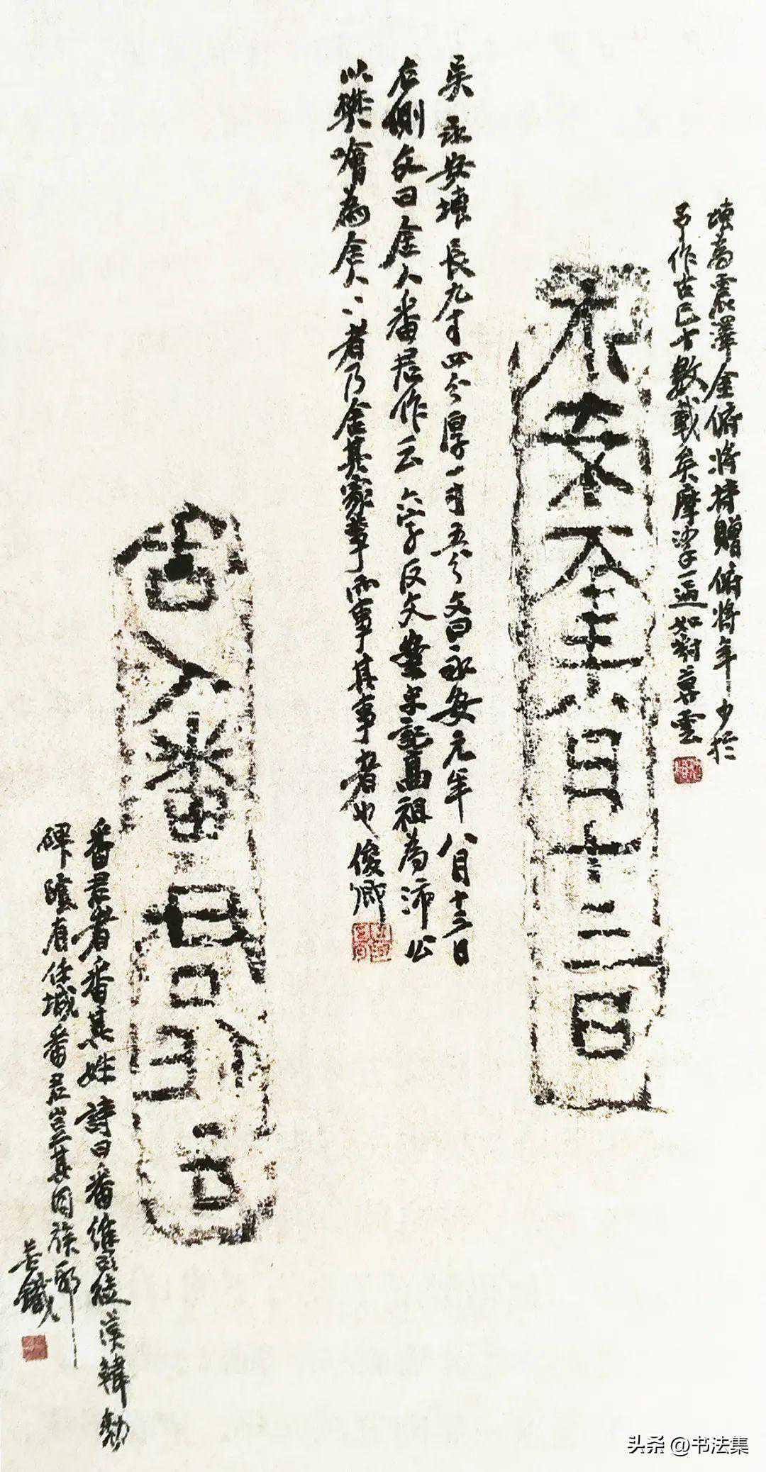 自宋欧阳修《集古录》以来,效仿者甚多。而金石题跋,需要的是学术和艺术的双重修养。明末清初以来,也有一些经史大家只跋不题,其中不乏以书法欠佳之故。吴昌硕诸艺皆精,又富于学养,尤其是在从吴云、杨岘、吴大澂游的过程中,积累了丰富的金石题跋经验。如《缶庐集》卷一《谢沈公周瑾赠赤乌残砖》、卷三《长生未央砖拓本为长尾》及手稿《汉砖拓本为日本友人题》,均体现了其在诗学、史学上的精深造诣,是不可多得的佳作。现经吴昌硕收藏或题跋过的砖拓,装裱成卷、轴,散见于各大拍卖公司拍卖图录,其中不乏杰构。