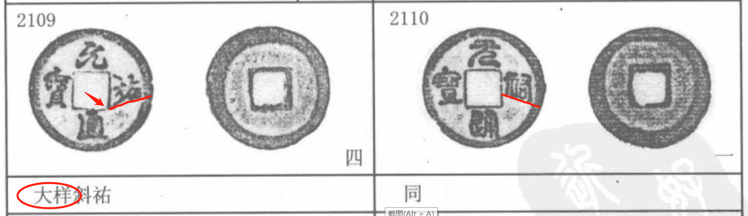 大样斜祐——元祐通宝小平平均尺寸都较小,大样尺寸在25mm附近,所以这两个版本的第一个特征是尺寸在25mm附近。行书版祐字自左下向右上斜,且左下的起点在穿口右下角。篆书版祐字短且明显从左上到右下斜。