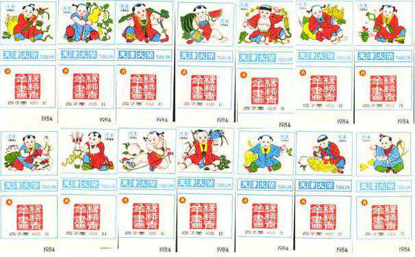 年画是火花好题材(见图36):年画,主要用于春节贺年并装饰环境,美化生活,是随着庆贺年节的风俗活动之形成和发展而逐渐完善的。天津火柴厂1984年印发的《杨柳青年画·百子图》火花,全套100枚,展示了100个孩童活泼可爱的生动形象及民间风俗。这套百子图年画火花规格为10.5厘米×4.5厘米,有横、竖两种式样。横版统一为右面正标是图案,左面背标是篆刻的大红印章“杨柳青年画”,其下注明“百子图”且有编号;竖版统一为上面正标是图案,下面背标是“杨柳青年画”印章及编号。这套年画火花图案上的孩童形象健康丰满,微笑稚态使人感到可亲,使用大红大绿等较大色块,造成民间绘画特有的鲜艳色泽,极富装饰效果,使欣赏者强烈感受到热烈红火、浓郁的民间和地方特色。