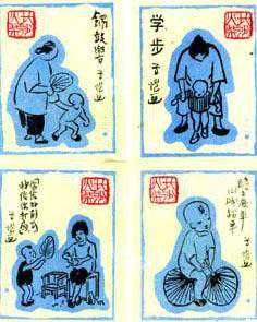 八十年代长沙火柴厂出产的丰子恺漫画火花一组12枚,构图全是儿童写照(图37),如《学步》、《锣鼓响》、《瞻瞻底车》等,看后发人深省,追忆童年,感悟人生,浮想联翩。人生只有学步,才能迈步、直至成长。然而学步离不开“母爱”的呵护与扶持。子恺先生以教育家的胸襟、寓画于教,其漫画的艺术魅力,真是感人肺腑。