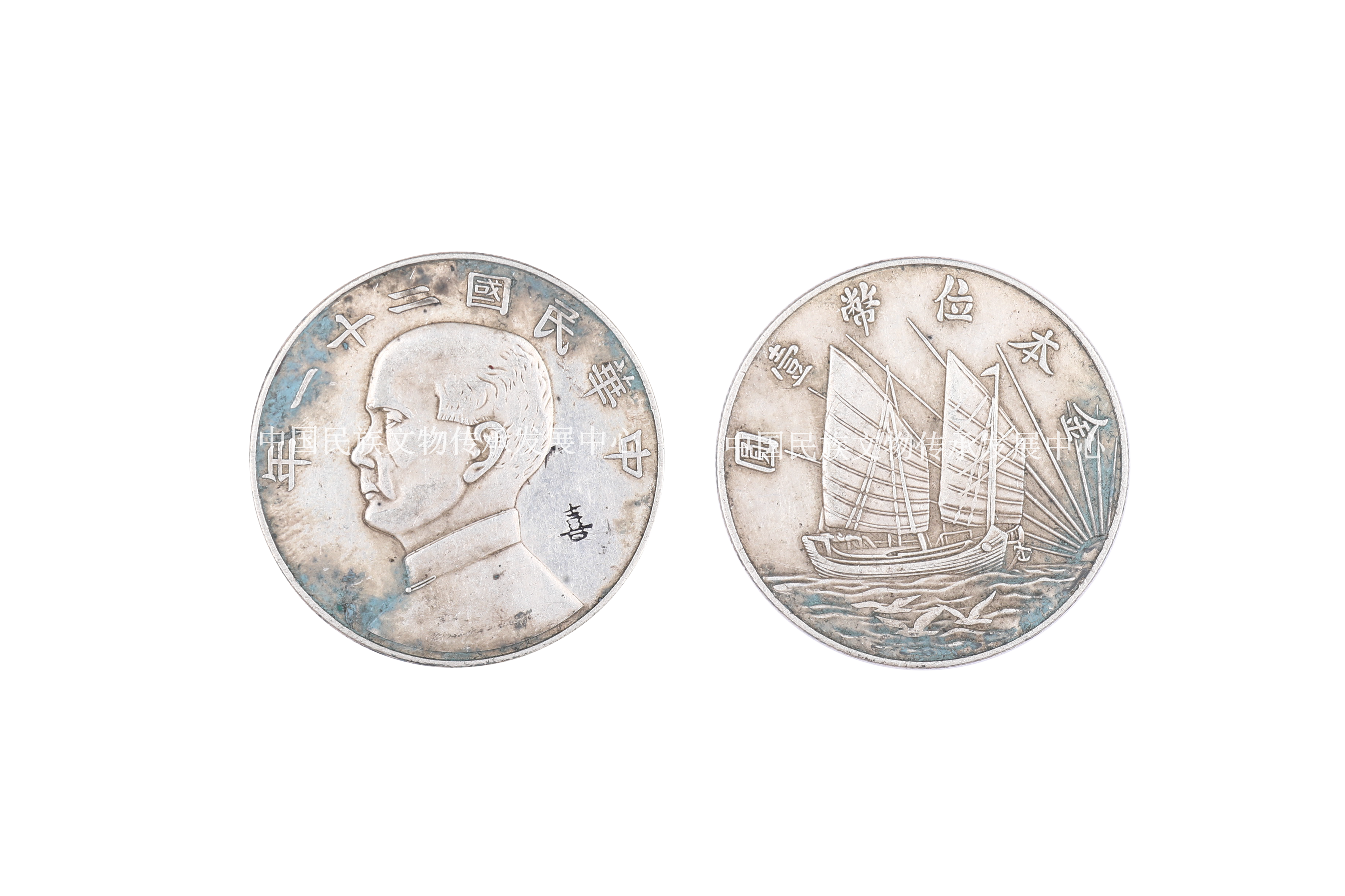 1929年(民国十八年),国民政府委托美国、意大利、英国、日本、奥地利等五国雕刻钢模,试铸孙中山正脸像伍圆银币,正面图案为孙中山先生西装正面像,孙氏头像上环刻铸造年份“中华民国十八年”字样,背面图案为三桅帆船驶于海上,帆船左、右刻面值“伍元”,这组样币因背面帆船上有三根桅杆,钱币收藏界俗称它们为“三帆船”币。