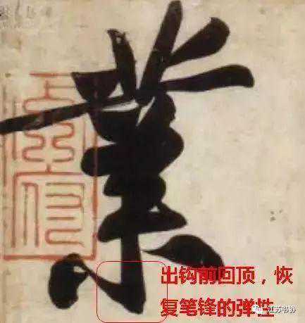 笔往前运走,就免不了要倒下来,弹性就会惭弱下去,需做个“回顶”的动作立起笔锋,如折角处的挫锋,挑钩处的蹲锋,捺底出锋前的微微回缩(所谓挫、蹲、回,都是回顶用劲的一种),均使散败的毛笔在一定的程度得以复原立起,甚至使笔处于特殊的强劲状态,铮铮欲弹走,大大增强了“笔力”。