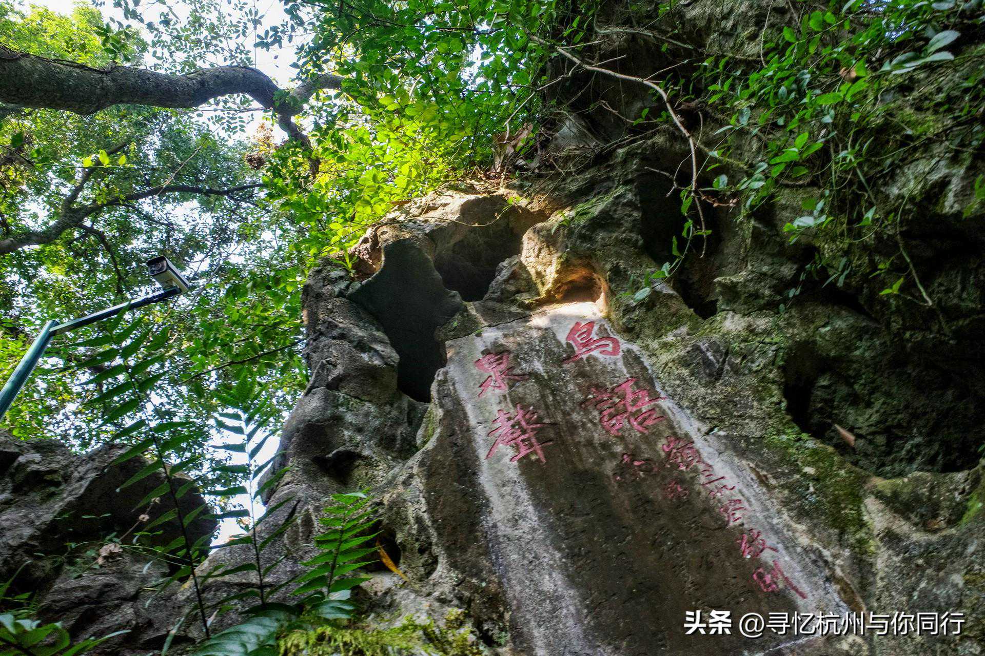 2021年10月23日,龙井泉旁的摩崖石刻“鸟语泉声”。