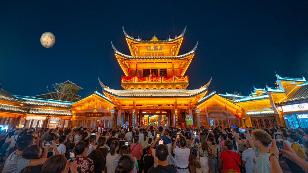 夜间大型古装巡游。巡游队伍着汉服装与本地民族服装绕着古城各街巷进行巡游活动与现场网红舞蹈表演。