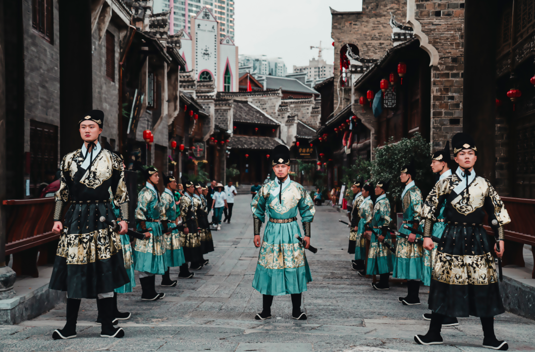 锦衣卫们在中南门老街实行通关文牒表演。身着飞鱼服,腰佩绣春刀,披风一挥,长裙一舞,英姿飒爽。