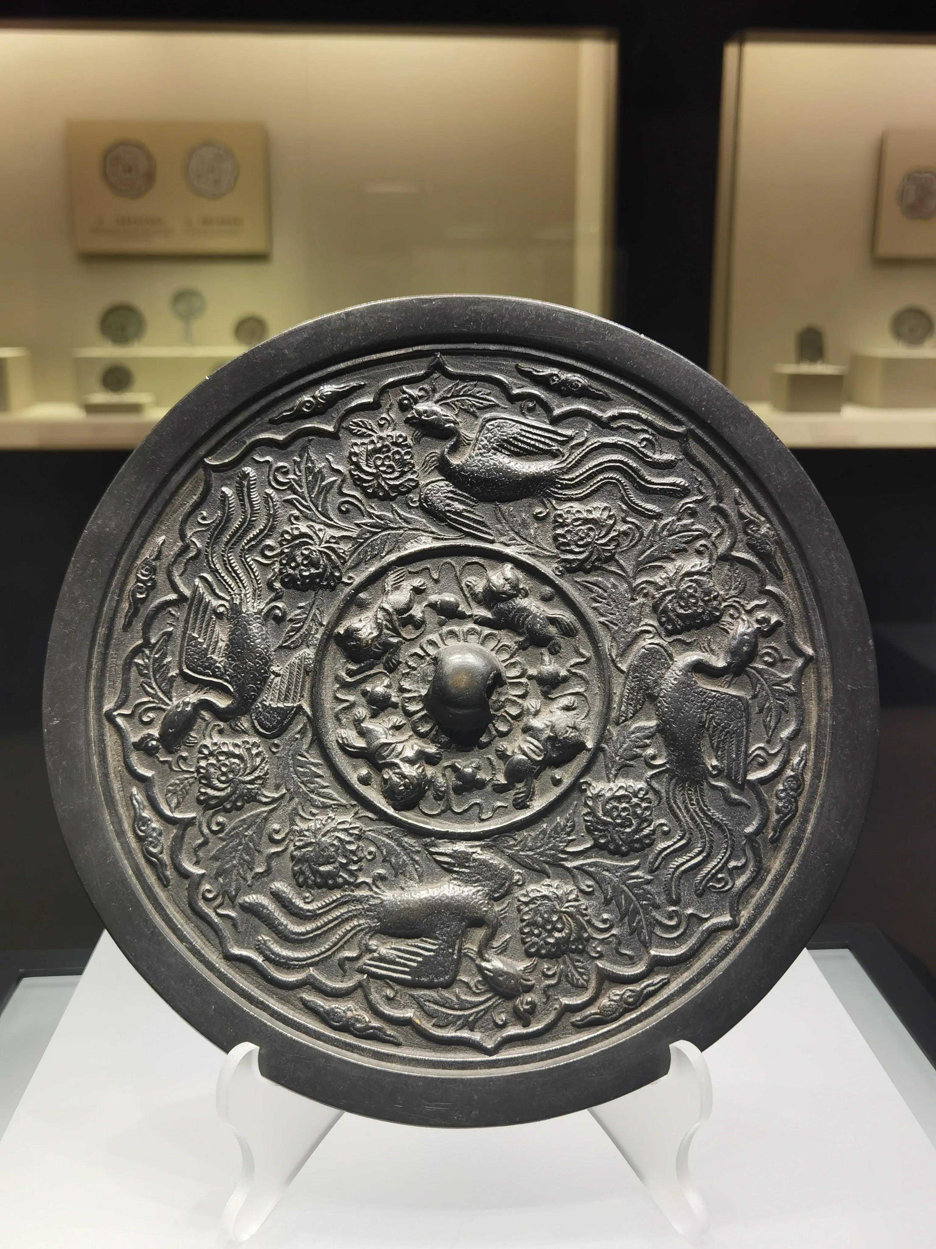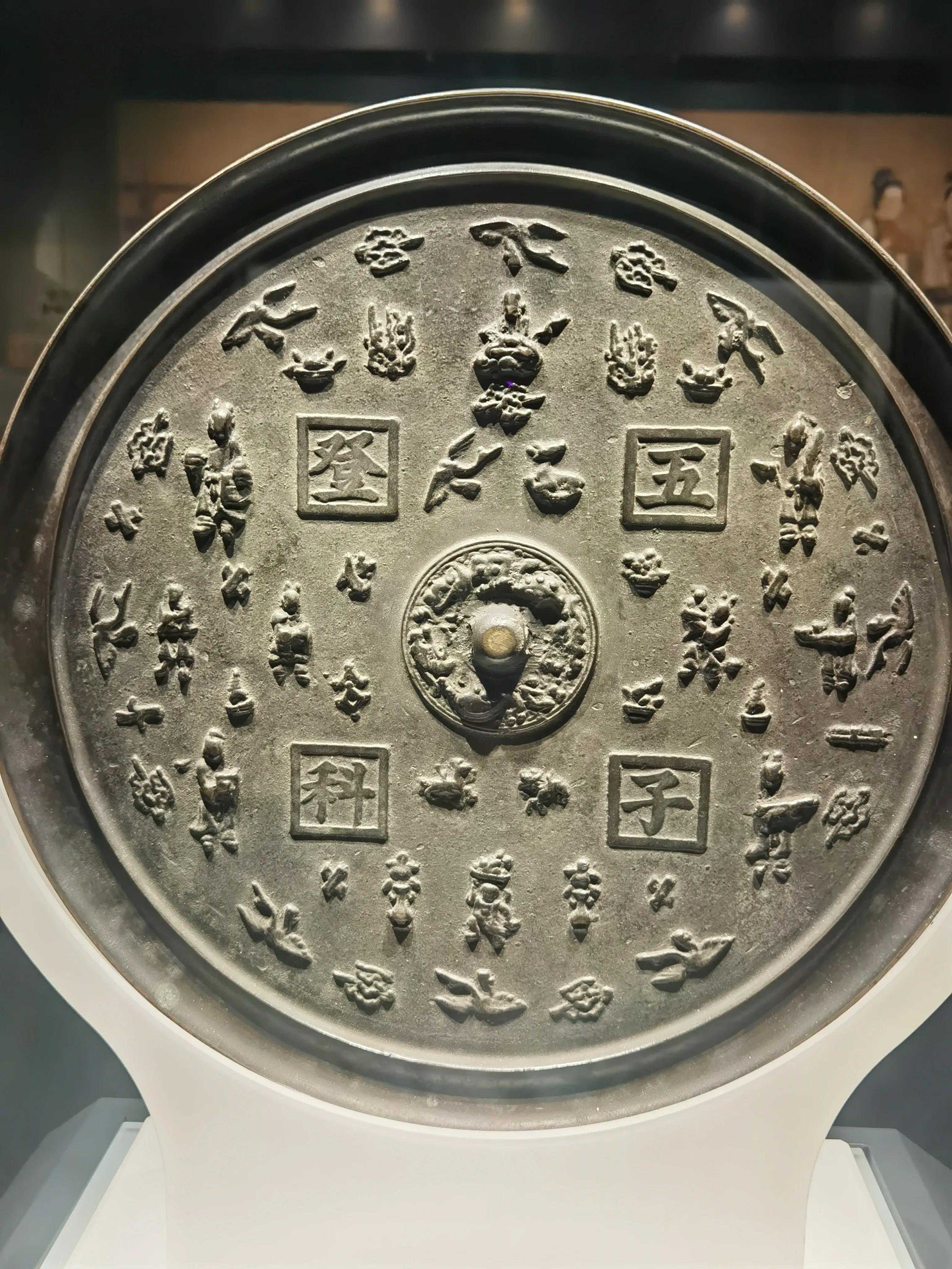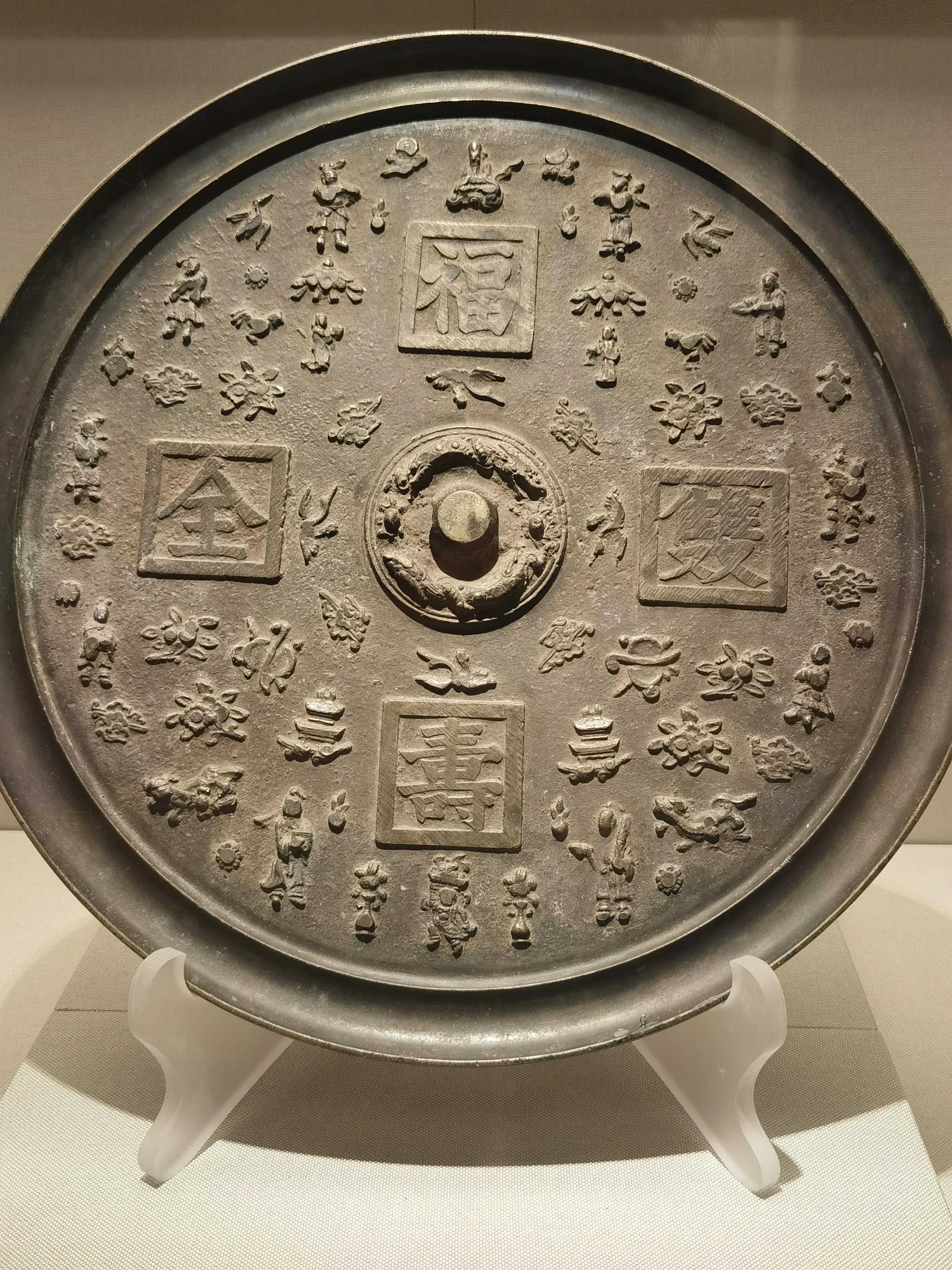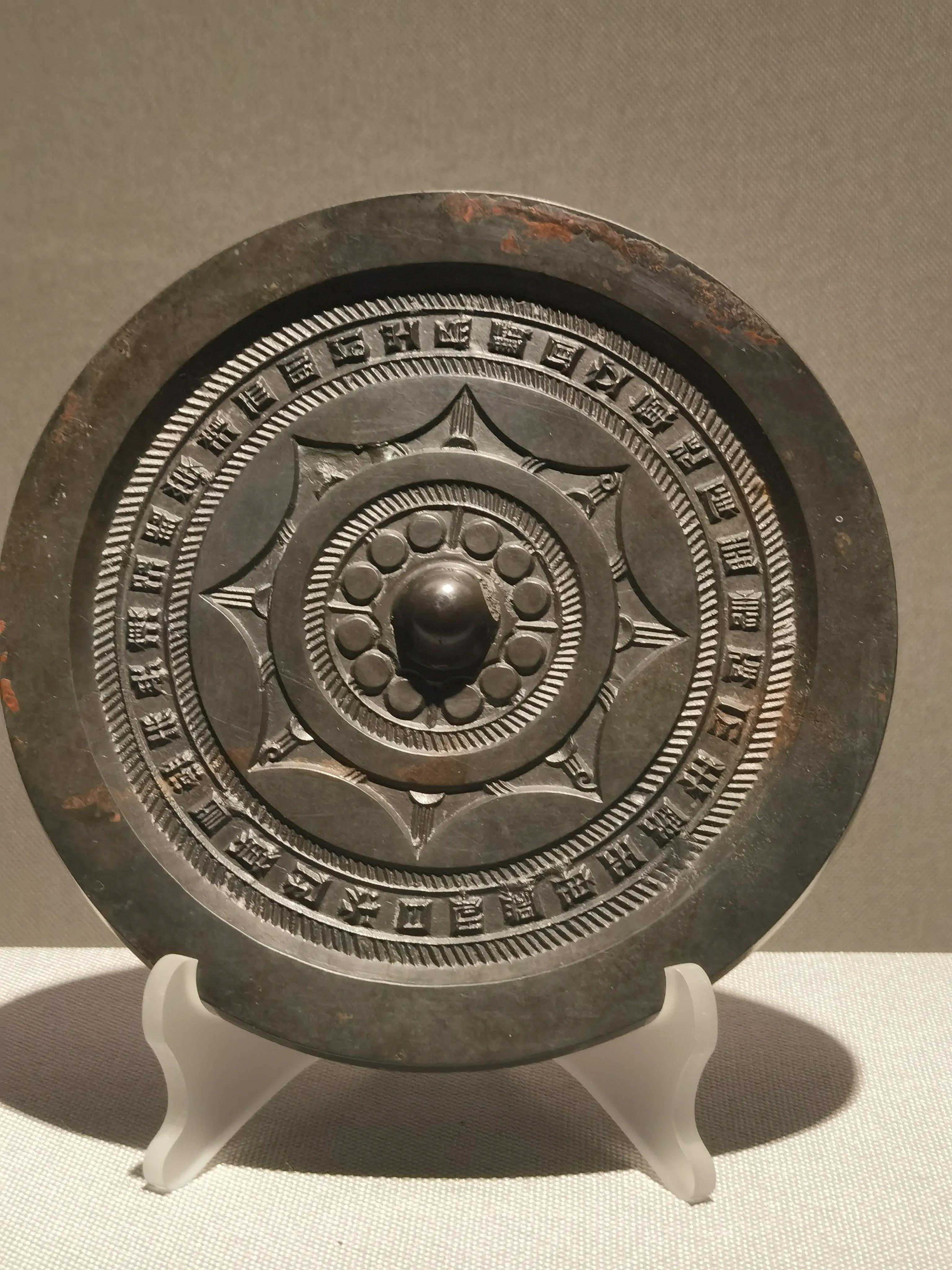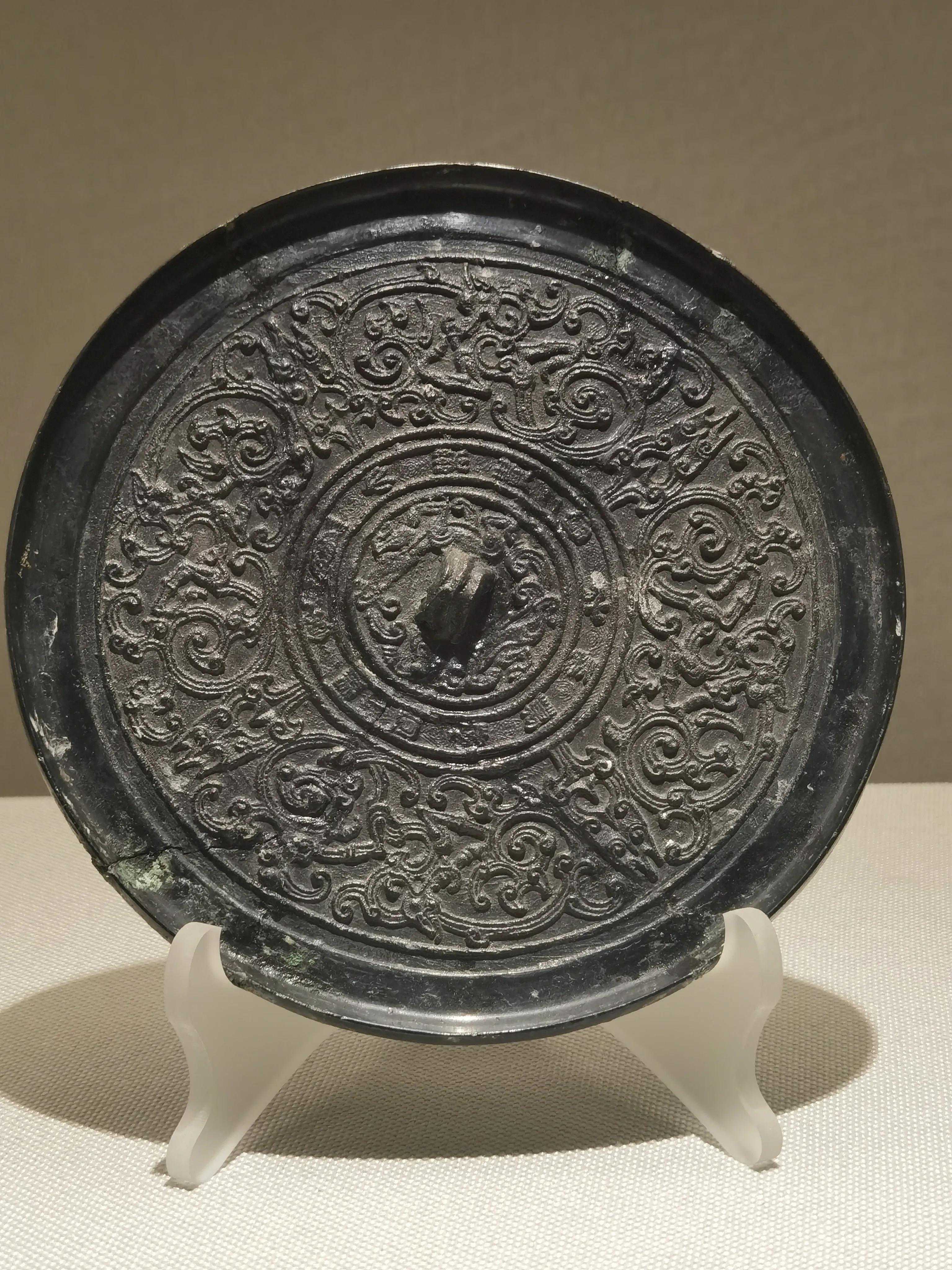 这里展出的铜镜,主要是让我们欣赏它背面丰富的铭文和精美的图案。