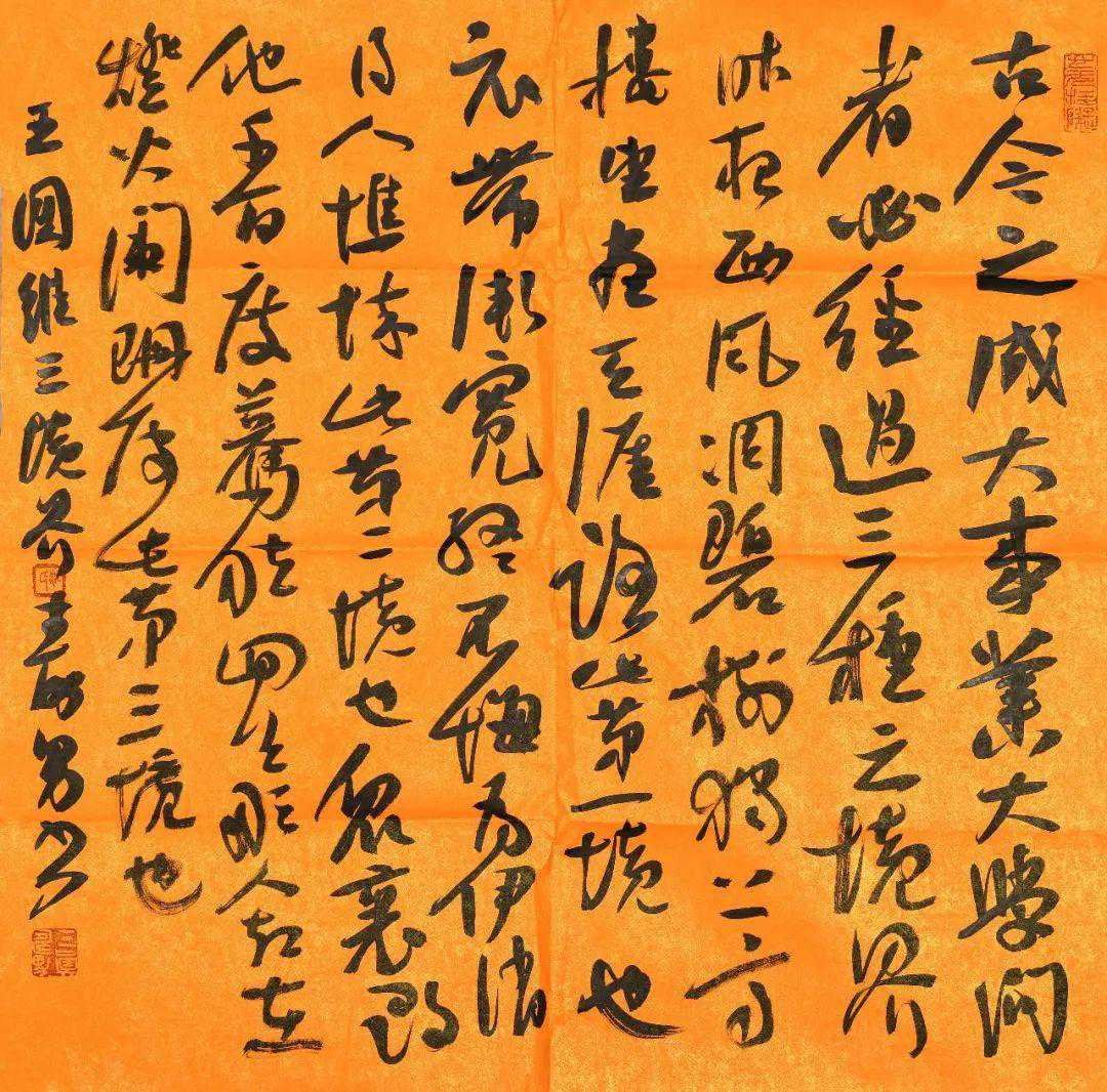 书法与自我。书法创作是绝对自我化的脑力及体力有机结合的艺术生命状态。书家的情感通过笔墨及书写内容得以阐释和抒发,进而达到一种契合中国审美习惯的视觉效果。从这个角度来考察,书法仅为借以展示某一类精神世界的形式或者是手段而已。归根结底,起决定作用的还是书法的主体精神,即书家丰富而多变的情感世界。在书写水平相近的前提下,同样的文字内容,不同的书家会有不同的表现,而同一书家,书写不同的内容也会呈现出不同的韵味,主宰此变化的不是笔墨纸砚,也不是条件或者环境,而是书家自身性情的投入,即不可直观且又举足轻重的情感元素投入。