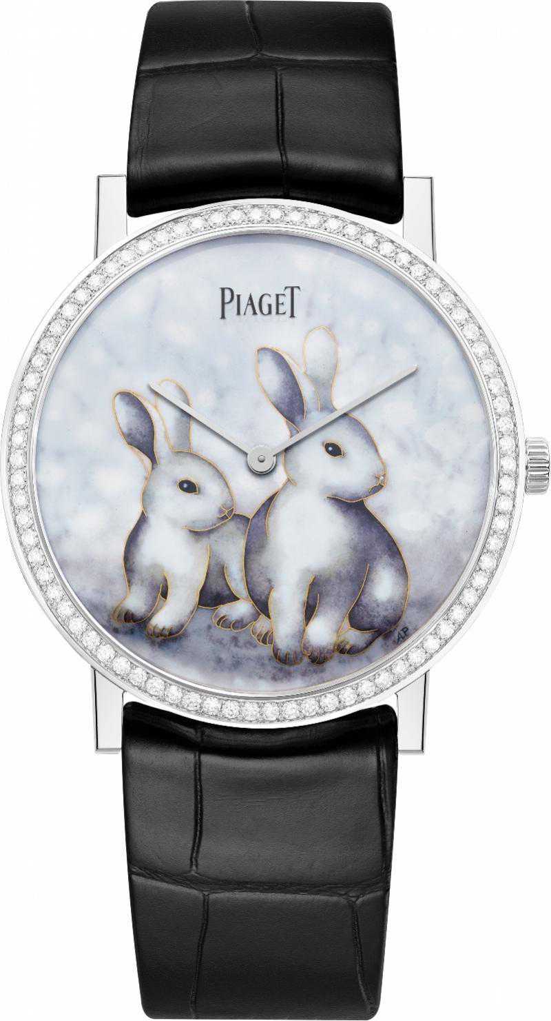 今年PIAGET伯爵倾情呈现十二生肖系列之最后一个生肖——兔年的限定作品,由珐琅艺术大师AnitaPorchet(自2006年起便与PIAGET伯爵合作)打造。表盘上两只灵动白兔惟妙惟肖,在饰有78颗明亮式切割美钻(约0.71克拉)的38毫米18K白金表壳的映衬下,倍显璀璨亮丽。