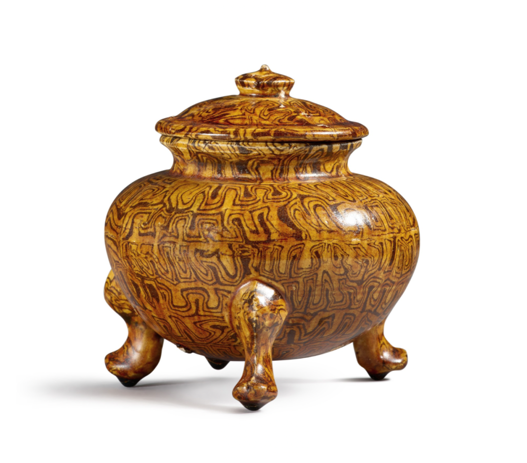 唐琥珀釉绞胎三足盖炉