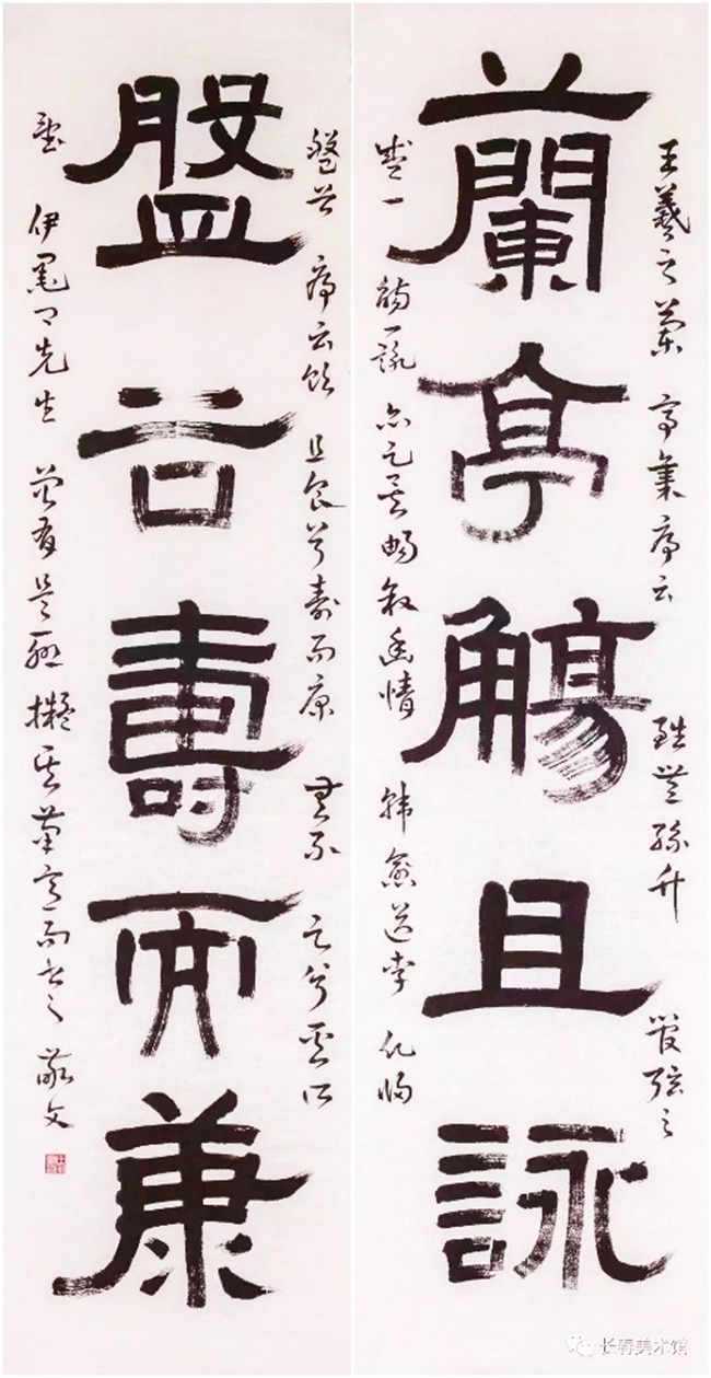 先生步入老年,草书作品铅华褪尽,笔势从容淡雅,火气全无。世人或有人言作品无早期潇洒纵意之气,怎知是返璞归真,是“众里寻他千百度,蓦然回首,那人却在灯火阑珊处。”系通透处方得心无挂碍,纯青炉火,人书俱老,书之意境系在拈花一笑间。隶书作品借鉴清人伊秉绶,庄严从容,有金钟大吕气象,庙堂之器。