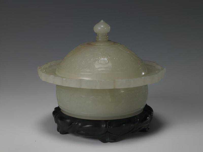 银盖托白玉碗,清,通高11cm,口径9.4cm,足径4.9cm。