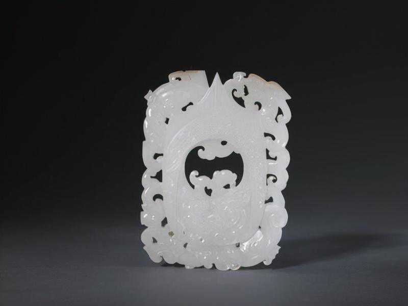 白玉镂雕荷包式香囊,清,高8.9cm,宽7.3cm,厚2.4cm。