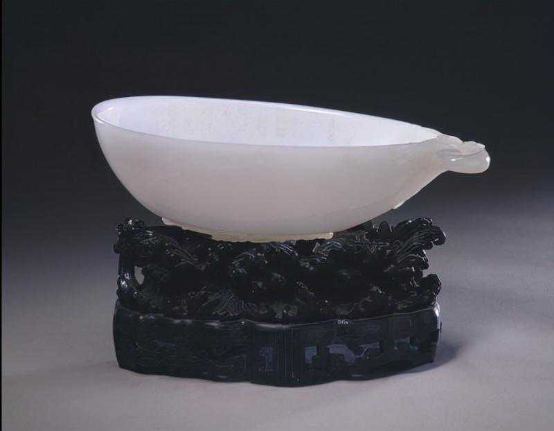 。此物选材精良,造型丰润鲜活,与深色器座相配更显出了庄重大气的艺术效果,为清中期玉器的代表作。