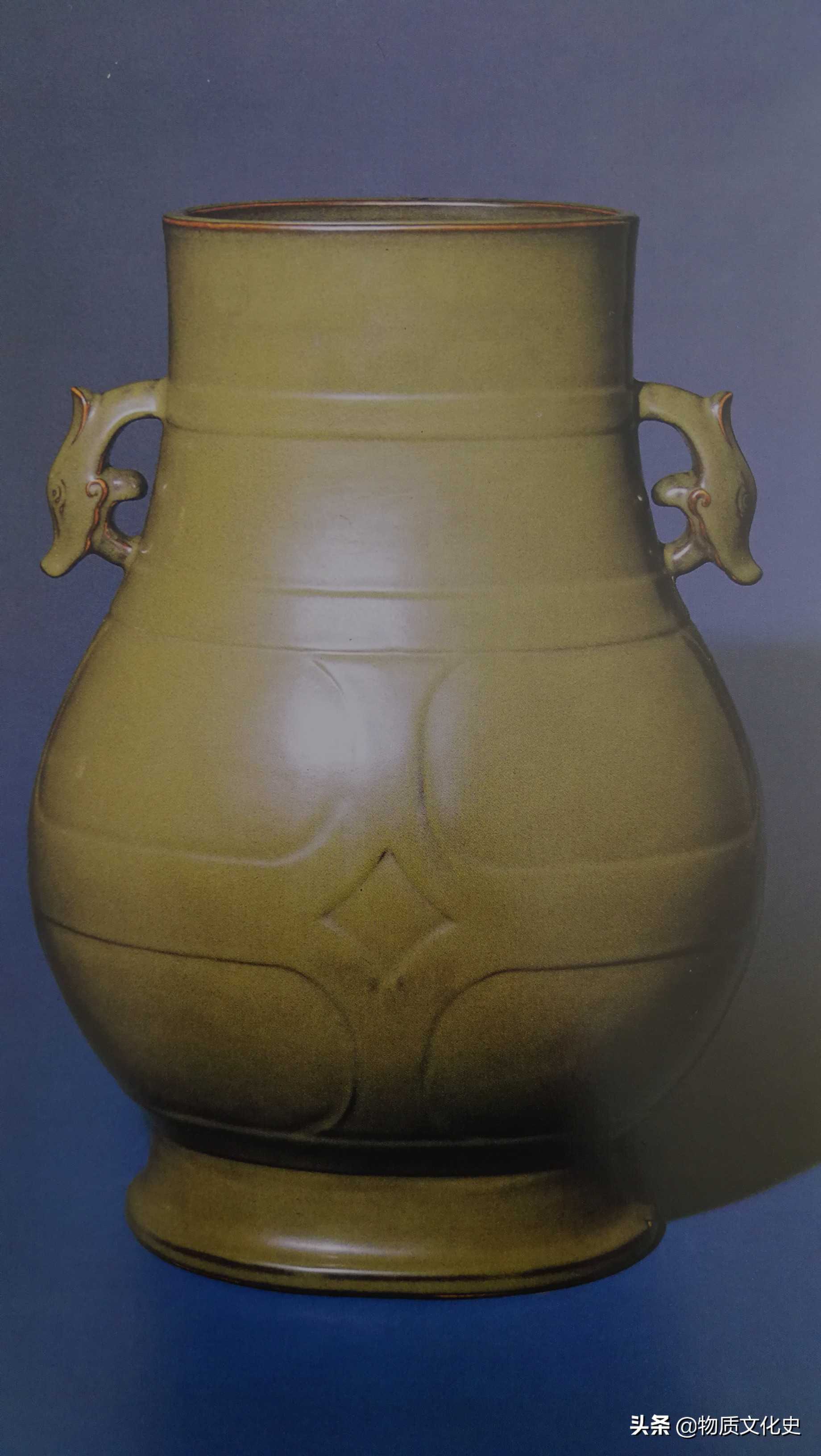 厂官釉牲耳尊,清乾隆时期所制,高51厘米,口径24.5/19厘米,足径26.7/21厘米。清宫旧藏。尊椭圆口,长颈,鼓腹,外撇高圈足。颈部两侧有兽耳。腹部以宽带弦纹分隔成菱形几何纹饰。通体及足内均施深绿偏黄色厂官釉。