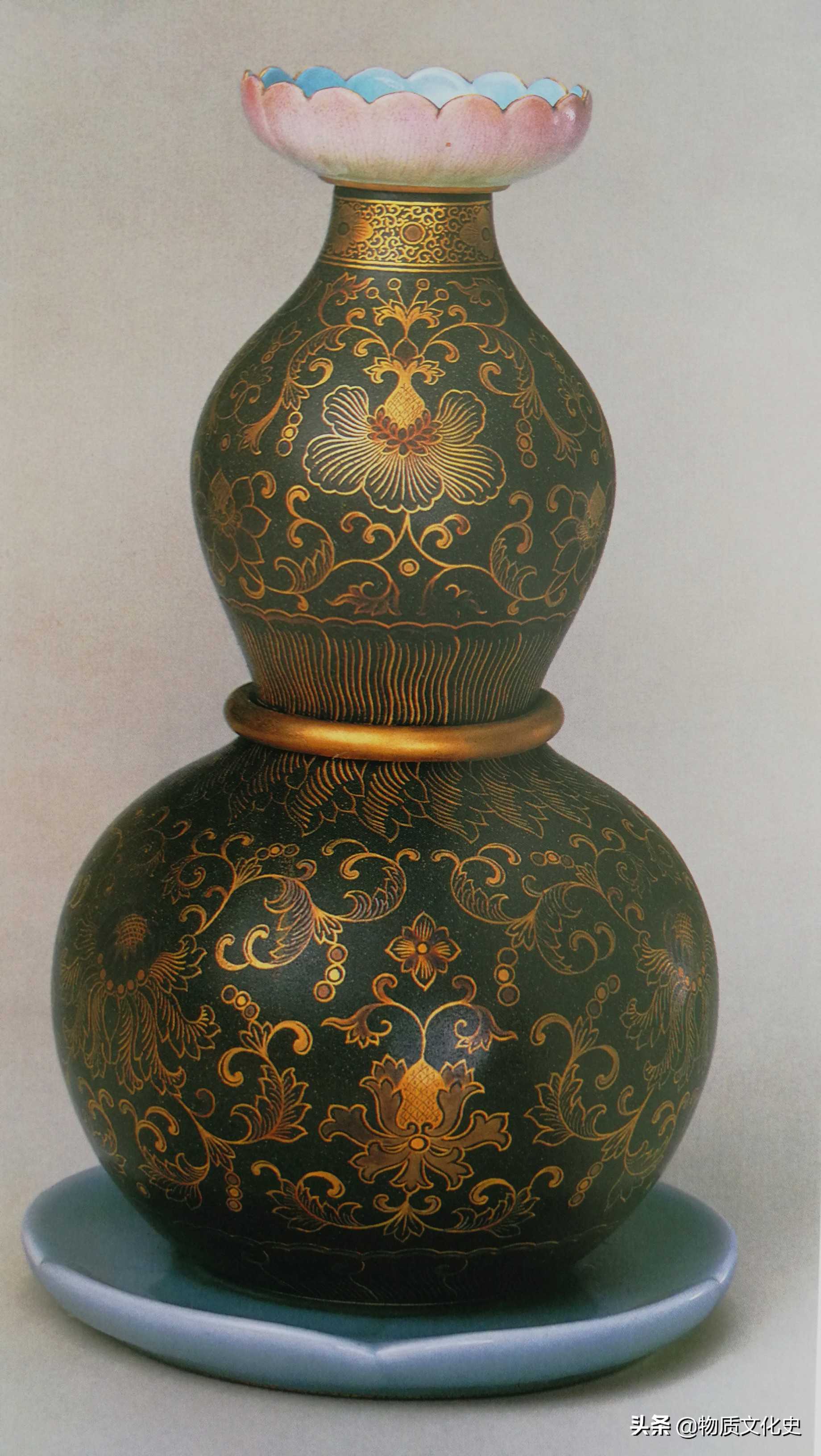 厂官釉描金花卉纹葫芦式烛台,清乾隆时期所制,高23.5厘米,口径6.5厘米,足径10.9厘米。清宫旧藏。烛台呈葫芦瓶式,莲花口,腹部套一金彩活环,底设承盘相托,盘为圈足。瓶内套有一圆柱连接口和承盘。葫芦瓶通体施厂官釉并饰描金彩花卉纹。托盘呈五瓣花口形,施粉青釉,无纹饰。