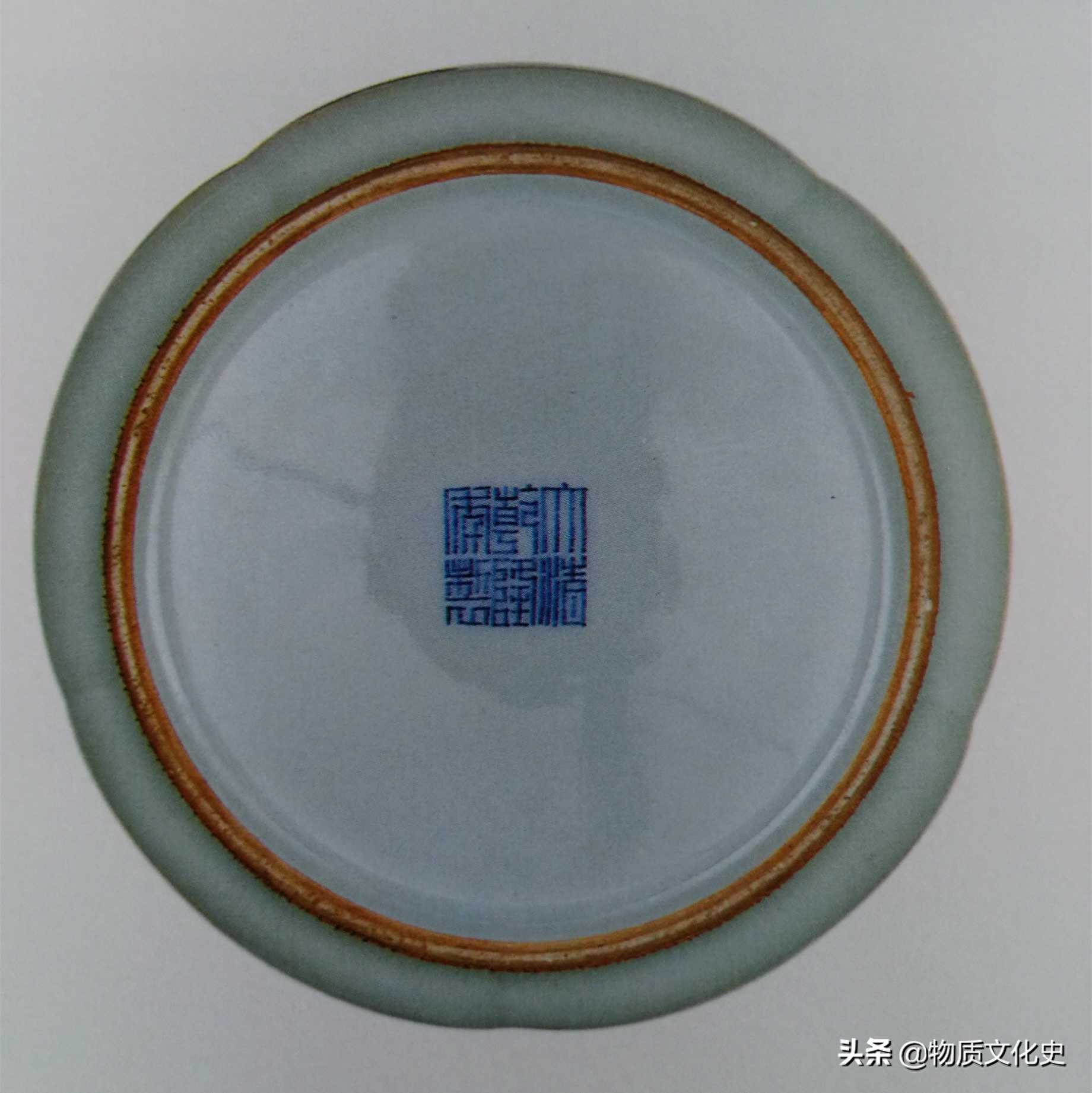 (接上图)足内有阴刻“大清乾隆年制”六字三行篆书款。此器型仿古铜器,釉面润泽,釉色黄、绿掺杂,这种厂官釉俗称“茶叶末釉”。“茶叶末釉”一词,始见于清末《陶雅》一书,比较通俗易懂,长期在古玩界流传,沿用至今。