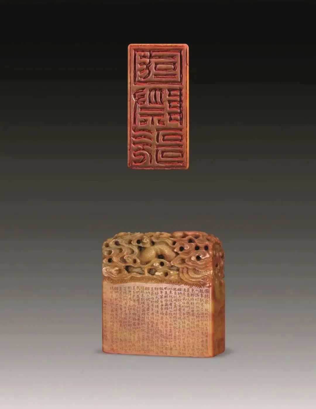 吴朴堂(1922-1966)刻青田石镂空雕双龙祥云钮印章