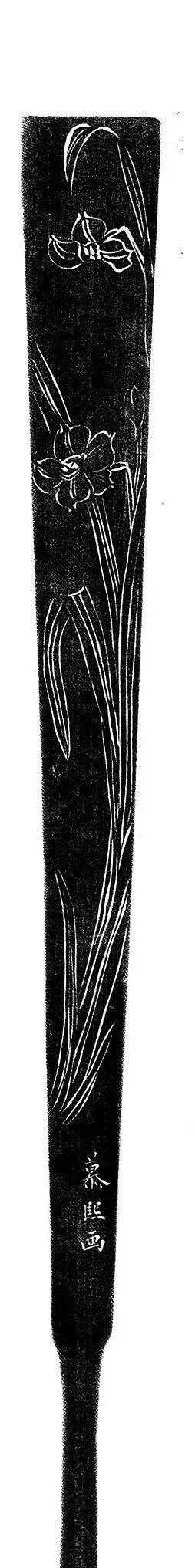 说明:扇骨为王福厂摹金文,徐植画水仙,高式熊刻,吴朴堂上款。