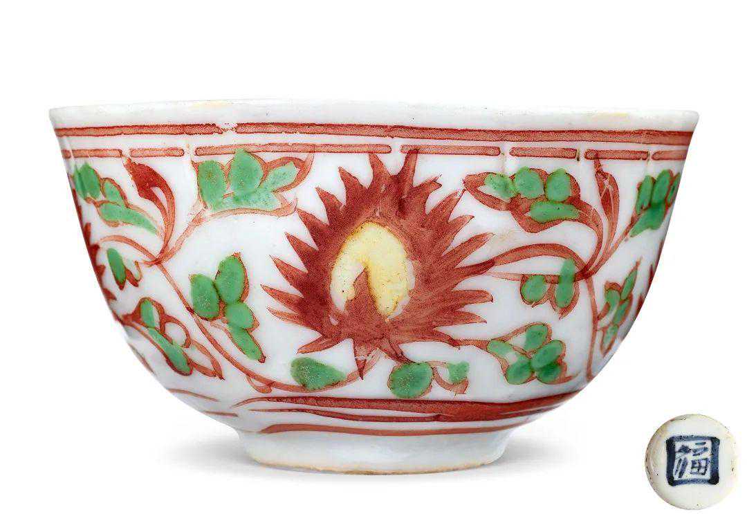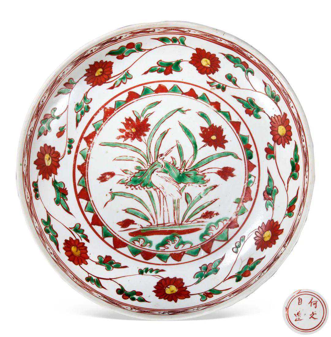 红绿彩瓷器在明代非常盛行,红绿之间的鲜明对比非常具有特色,此盘颇有明代风格,色彩鲜艳明快,线条豪放流畅。鹭鸶与莲花富有「一路连科」的良好寓意,聊聊数笔即构成独特的绘画艺术语言,盘底落款“何文自造”推估为出自民间窑厂之作,盘形圆润对称,胎质细腻洁白,更凸显红绿彩的浓淡交错,笔墨运用自如好比纸上作画,饶富趣味。此盘曾由东京知名美术商壶中居旧藏,后经日本知名画家小林古径(1833-1957)纳入囊中,附箱上小林先生的“古径”落款即由此而来,传承有序。