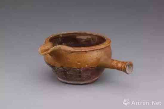 茶铫为煮茶器。这件邛崃窑黄釉茶铫,口沿有唇,深弧腹,平底。器腹中间有一竹节形横把,与之成90度的一侧有匜形流。砖红色胎,带有强烈的四川邛崃窑瓷器的地方特色。器腹只施半釉,器内也不施釉,系实用器。