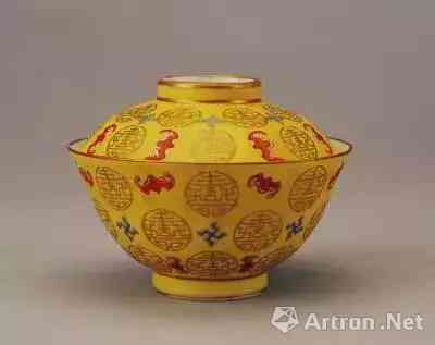 黄地红蝠金团寿字纹盖碗,清同治,现藏于北京故宫博物院