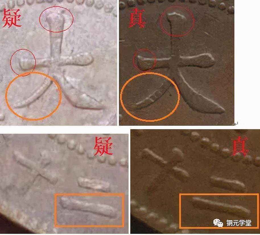 上述两枚,背面基本铜模,按理说文字应该基本一致,但我们比对时发现,背面的“分”字真品粗而有力,存疑币细。再看正面文字有类似的问题。正面整体细了以后,就会觉得文字风格有很大出入。