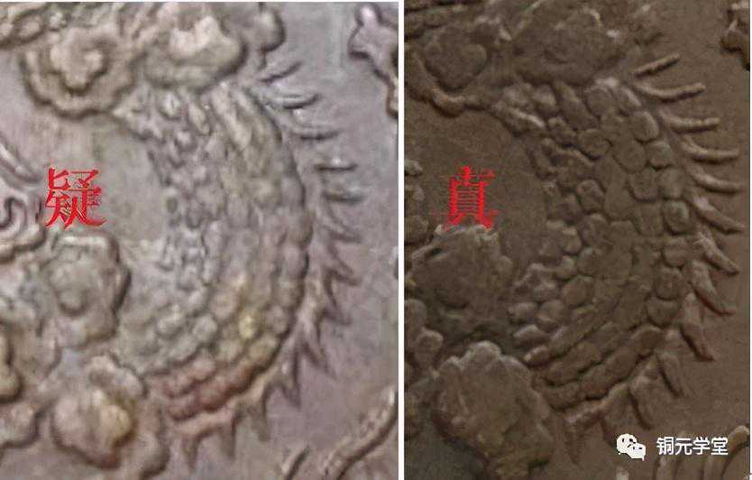 首先,我们看到真品在龙背有浅浅的挤压纹,3点类似“流铜”是磕碰造成的,并非后滚边的流铜。这种浅浅的挤压纹,是无法形成后滚边的“流铜”的(挤压出的铜屑还不够多不够高,这个就是打制压力问题)