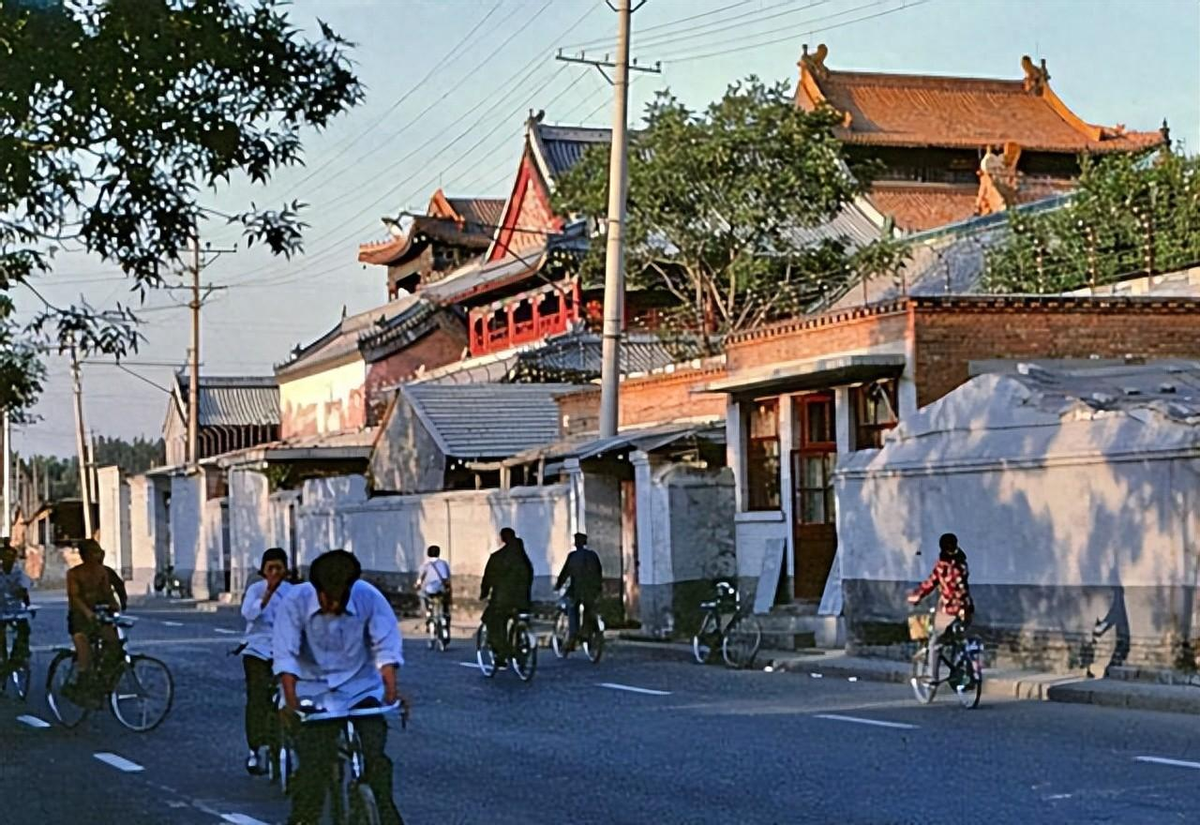 北京,1983年雍和宫大桥以南的街道景色。马路上有很多人在骑车。
