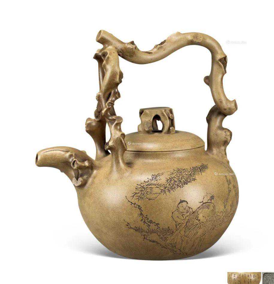 此壶为东坡提梁式,紫泥胎质,温润如玉,以枝干三叉为提,取一截树干做壶钮与流,形态自然拙趣,做工精湛,大气磅礴。壶身由任淦庭铁笔镌刻,其刻绘技艺精湛,文雅脱俗。盖内落款“星辰制造”,星辰即清末民国时期紫砂艺人,喜与文人交往,所制器物往往有刻绘装饰。此壶壶身硕大,气势磅礴。此类大壶在清末民国时期就非常少见,而能完整保留至今者更是凤毛麟角,弥足珍贵。