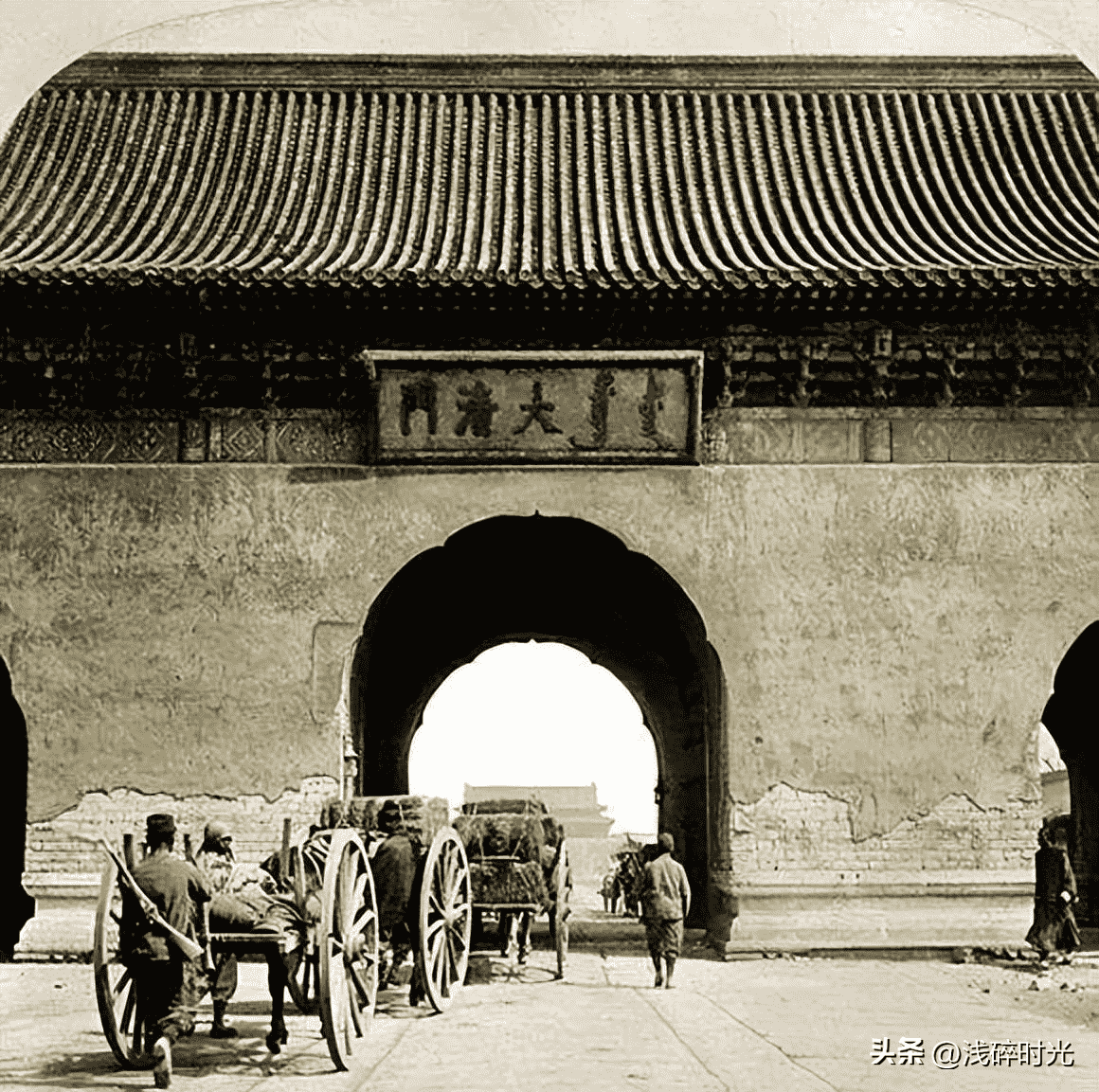 清末老北京皇城大清门,一群商队正在前行。